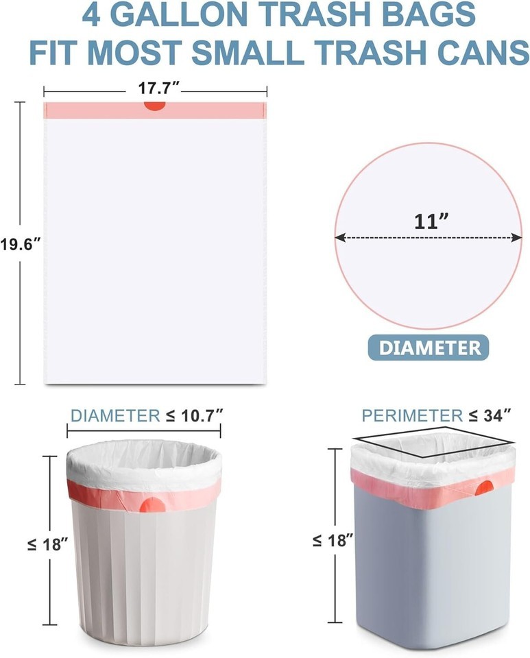 4 Gallon Trash Bags - JUKFITA small garbage bags are 17.7" wide x 19.6" high, fit most 2/3/4 gallon trash cans(15L). Please make sure your trash can edge is less than 34in.