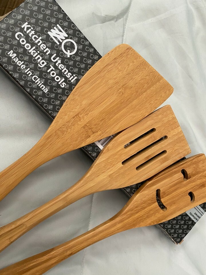 Spatula for Cooking, Kitchen Set of 3, Natural Bamboo Wooden Utensils, 13 Inch F