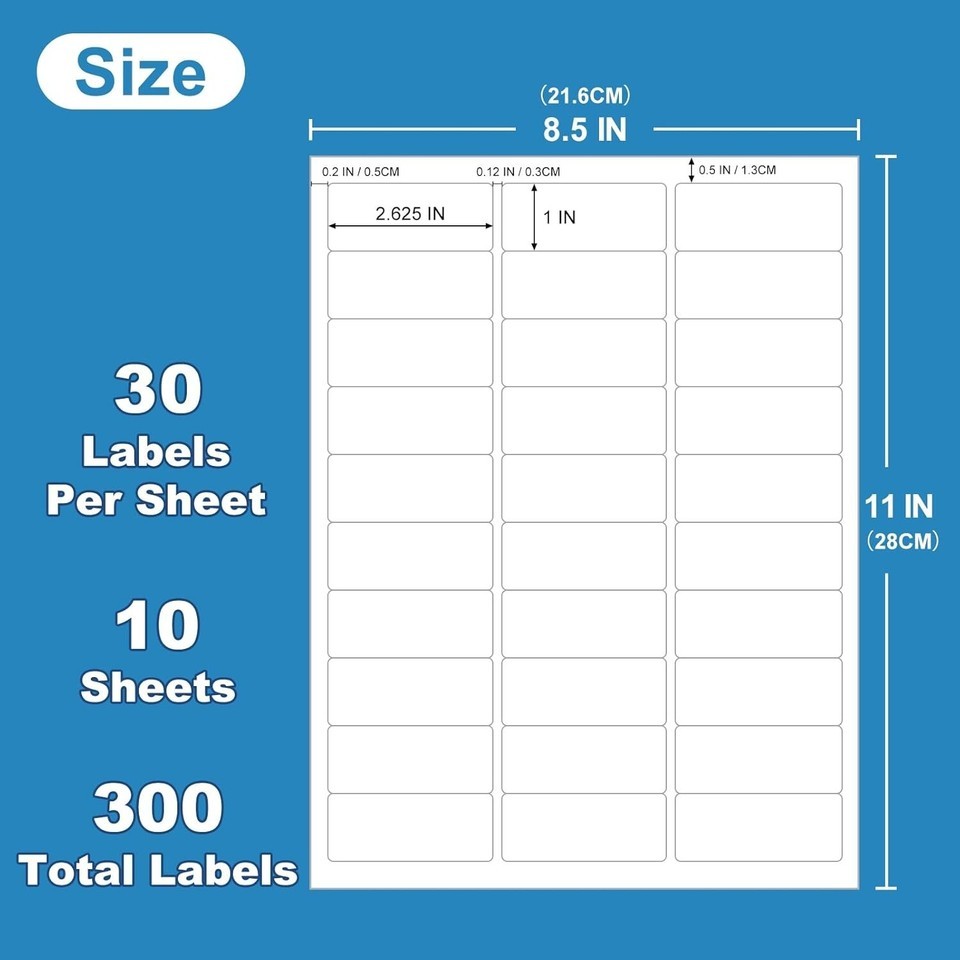 Perfect Label Dimensions: 1" x 2-5/8" Shipping Address Labels, 30 labels per sheet, 10 sheets totaling 300 Labels. Sheet Size: 8.5" x 11"