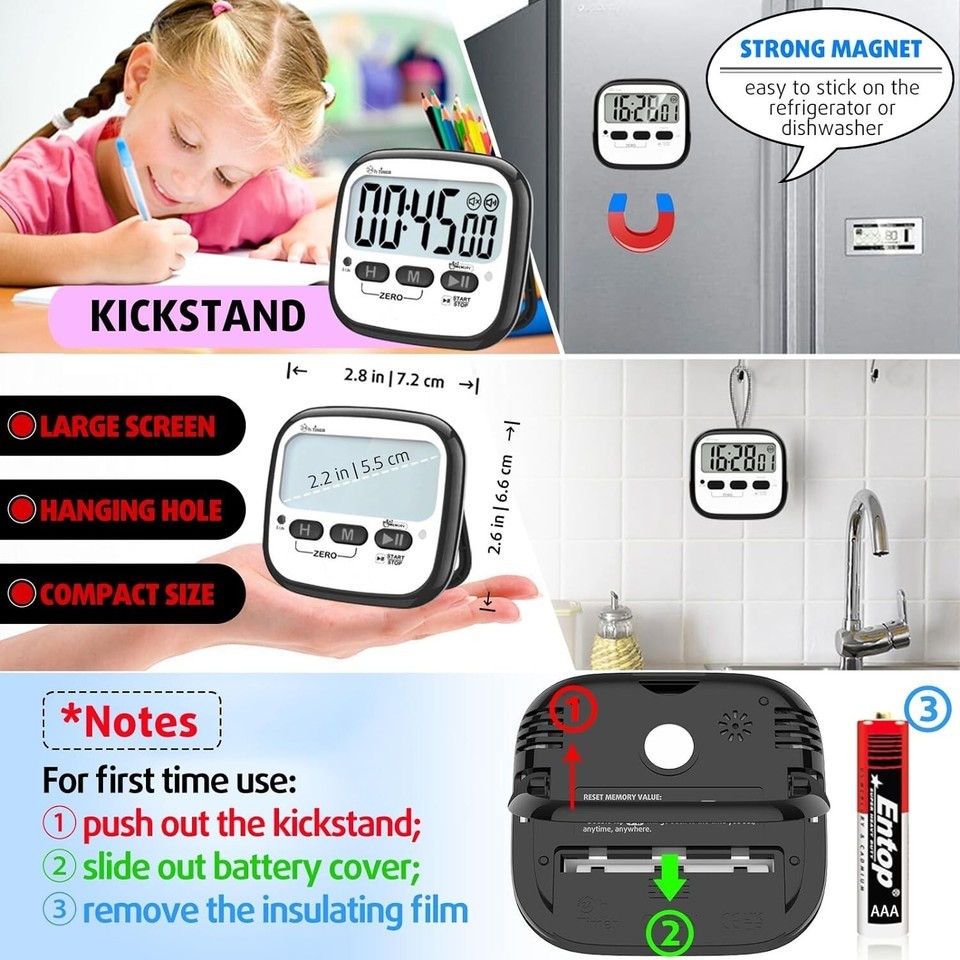 The strong magnet, durable kickstand and hanging hole makes the cooking timer is convenient to be placed everywhere. The compact design with large LCD display is easy to operated for kids and the elderly. [ *** Open the kickstand and unwrap the battery film before using. ]