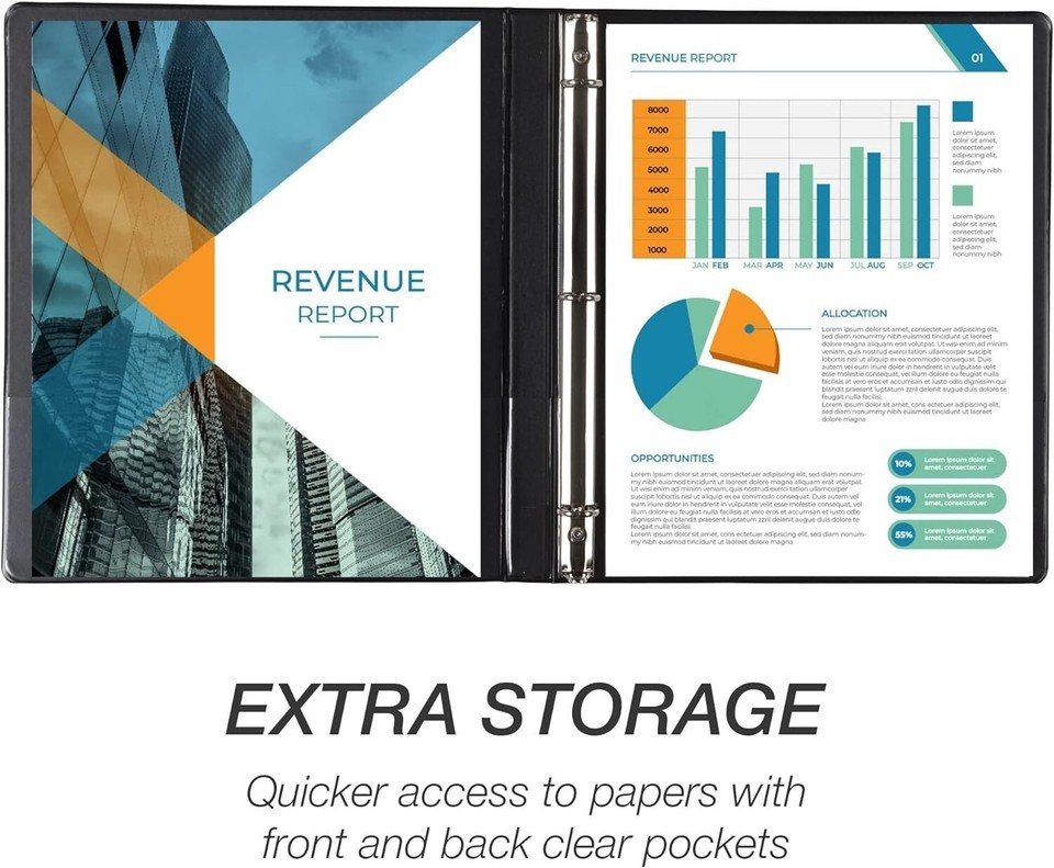 Easy Customization: Perfect for organization and presentations, this half-inch binder allows for complete customization via a clear overlay with a non-glare finish; 2 clear interior pockets provide additional paper storage
