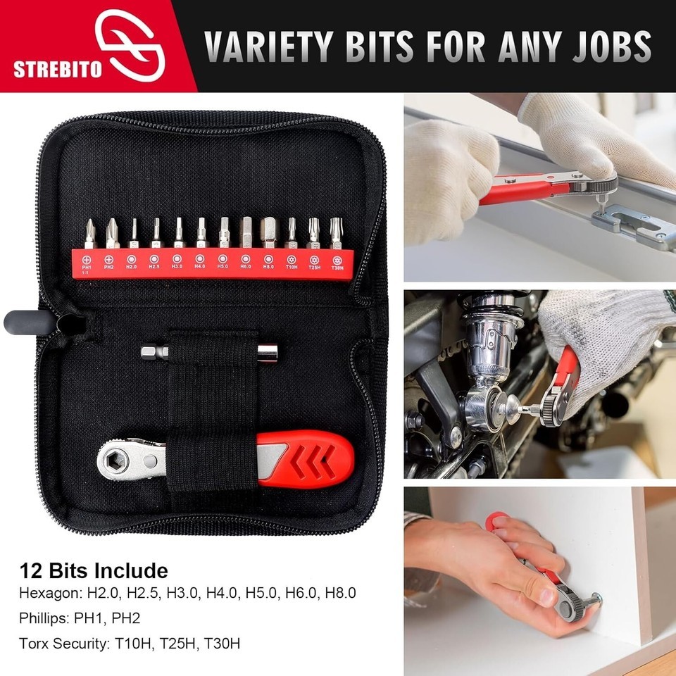?Versatility Compatibility?STREBITO small ratchet set contains 12 bits covering the most popular screw profiles for bike, RV and equipment. Metric Hex 2.0, 2.5, 3.0, 4.0, 5.0, 6.0, 8.0mm | Torx Security T10, T25, T30 | Phillips PH1, PH2. The 1/4 drive ratchet is compatible with all 1/4" hex standard bit, extended your usage. Also included a extension shaft for reaching those hard to get places
