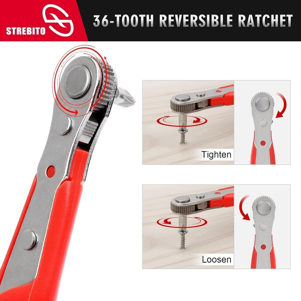 ?Ratchet Mechanism?With an Allen key or Torx key, each time you tighten or loosen a screw, you remove and re-insert the tool multiple times. With STREBITO reversible 1/4 inch ratchet, your can stay on-the-job without any additional insertions. With a 36-teeth ratchet system, this right angle screwdriver ensures smooth ratcheting in both directions, making tightening or loosening screws a breeze.