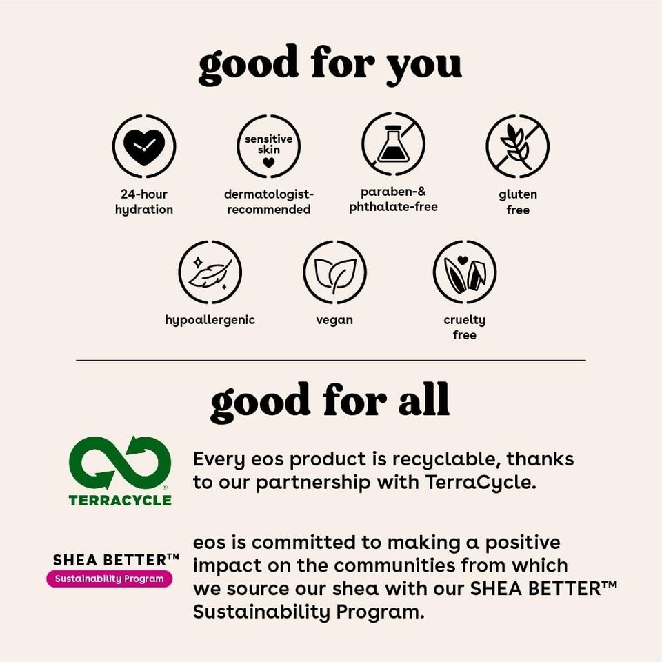 ALL-NATURAL SHEA BUTTER: eos skin care products have wild grown, sustainably-sourced 100% natural shea butter to make skin feel moisturized, protected and soft; We are paraben, phthalate and gluten free, Dermatologist tested, Hypoallergenic, Leaping Bunny certified, No products tested on animals
