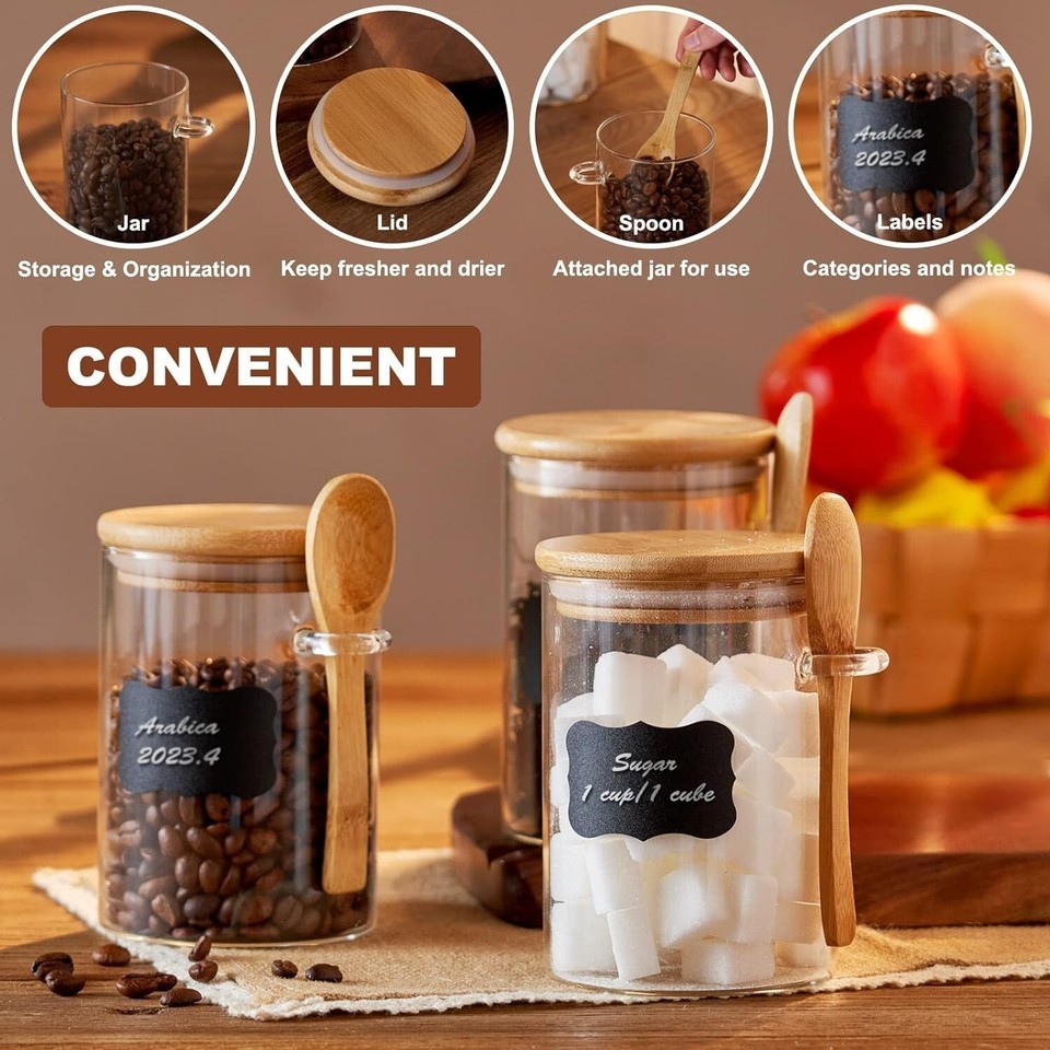 ?Material? These glass storage jar are made of high-quality borosilicate glass and premium natural bamboo, which are BPA-free, heat-resistant, durable, eco-friendly and healthy. The unique design is clean, transparent, making it perfect for any decor style. The integrated design allows for better storage and use of the spoon, and labels allow you to better labels the varieties of coffee and tea, the date of the food