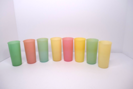 Vintage Tupperware Pastel Tumblers Cups 6 oz Juice Glasses. Pre-owned in good condition for the age. Some light to normal signs of wear and use. Some signs of discoloration to a couple of the cups. See all photos for details and condition. Will ship USPS Ground Advantage.
