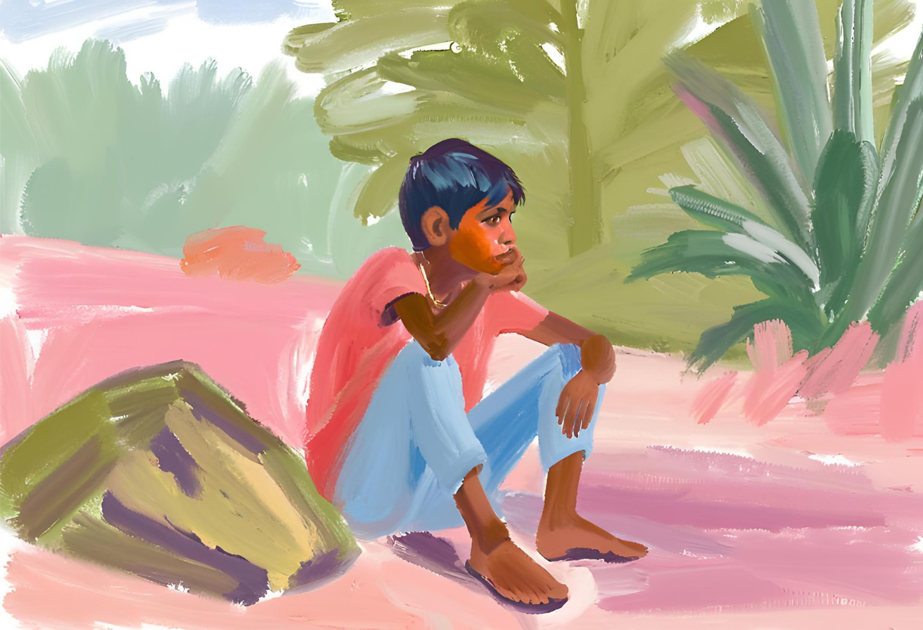 "Echoes of a Distant Home" radiates tropical serenity, depicting a contemplative figure seated beneath swaying palm fronds on sun-kissed pink sands beside azure waters. The painting's soothing palette is rendered through soft coral beaches, lush emerald foliage, and gentle turquoise waves, with warm flesh tones and vibrant clothing creating a composition that is both peaceful and evocative. The artist's delicate brushwork and harmonious color blending against the paradisiacal setting evokes a sense of longing and tranquil reflection, inviting viewers to experience the bittersweet beauty of memories and distant places within this dreamy, sun-drenched sanctuary.
