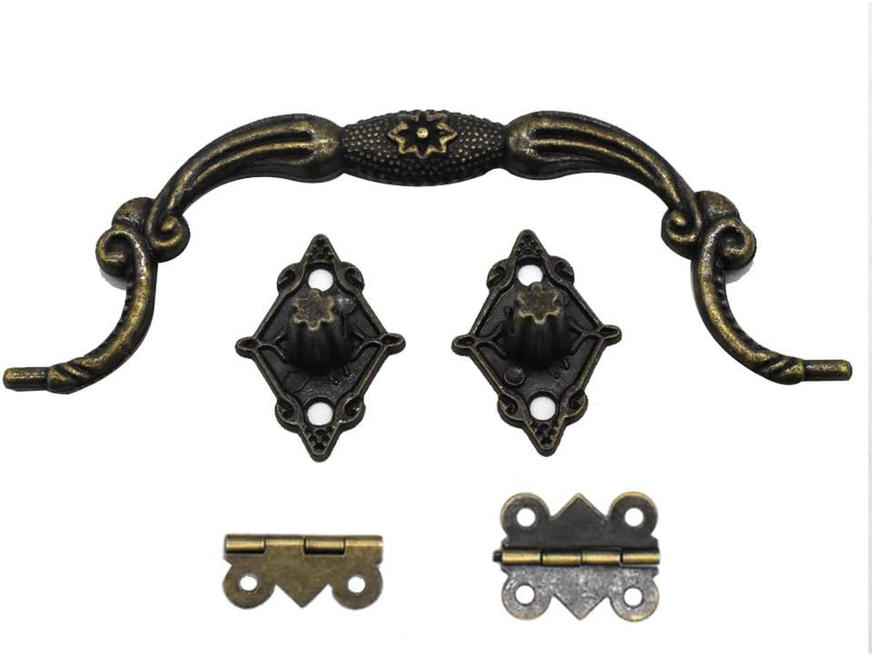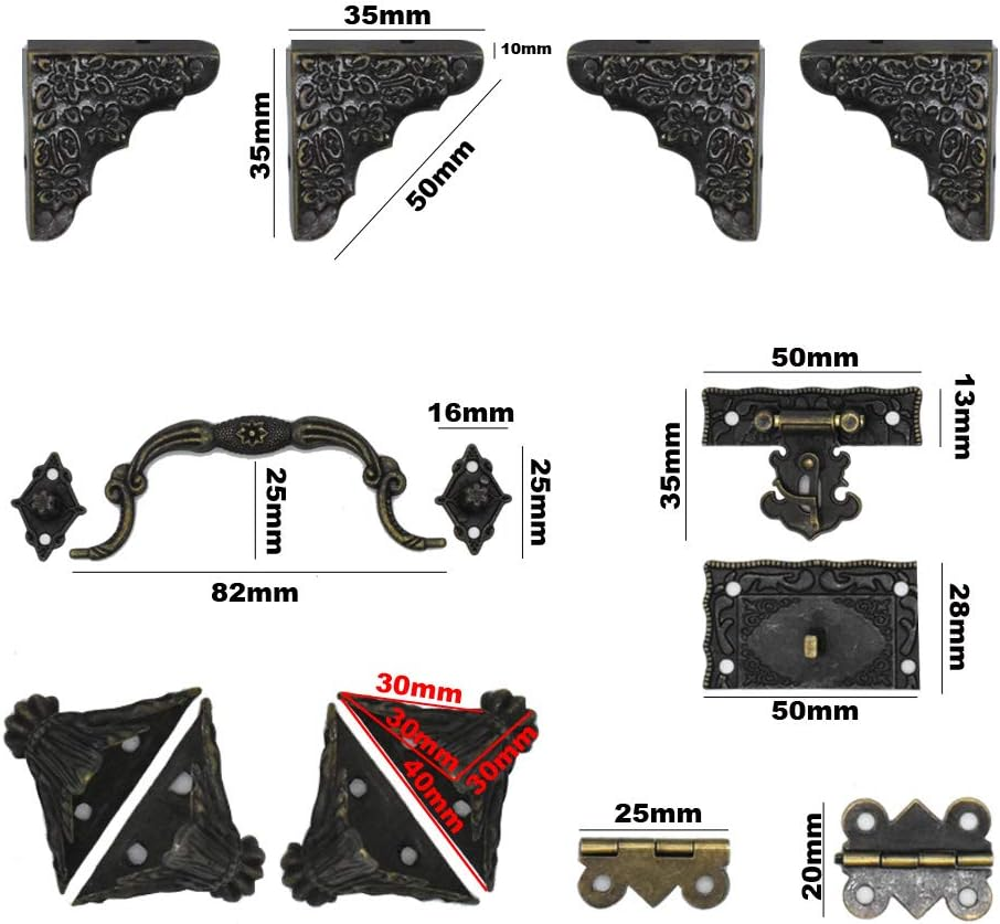 ?Package Includes? This comprehensive Antique Bronze Jewelry Box Hardware Kit features 2 antique lock latches, 4 sturdy hinges, 2 elegant handles, and 16 protective corner guards, providing everything you need for your project.