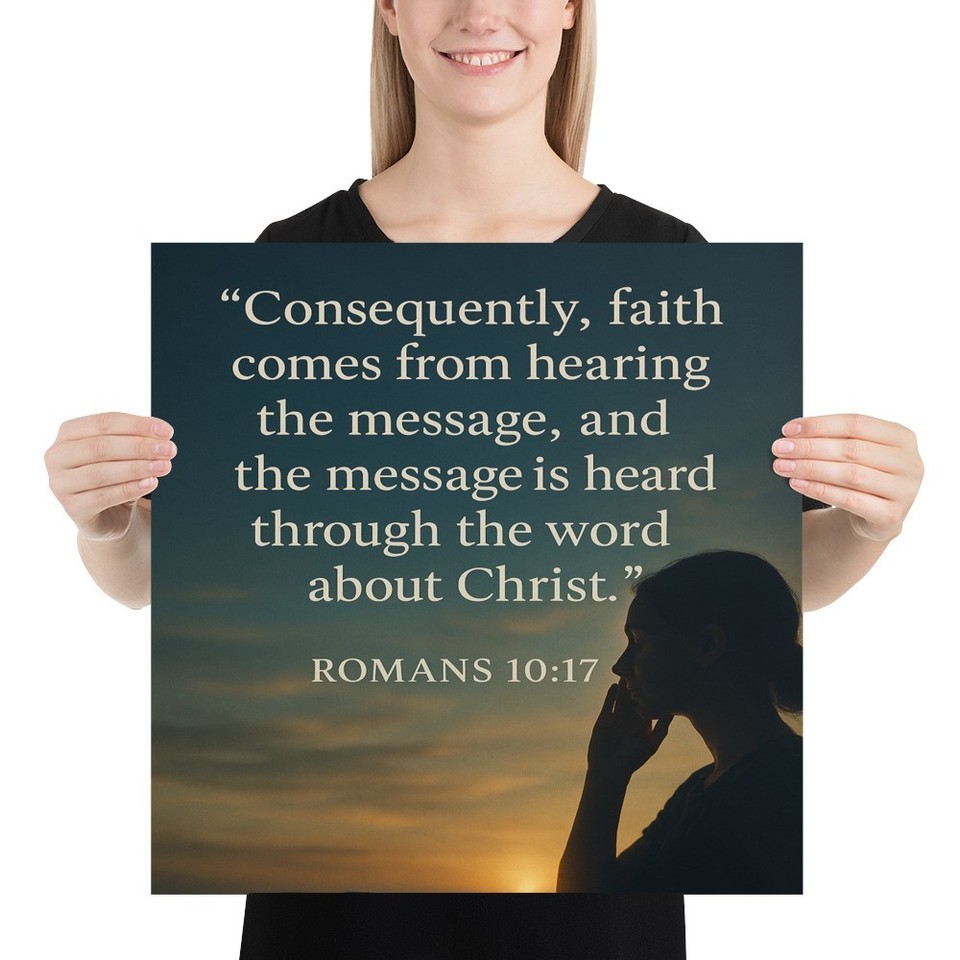 Bring encouragement and spiritual beauty to any room with this inspiring 18" x 18" poster featuring Romans 10:17. The verse is displayed over a peaceful sunset background with an open Bible and a figure deep in thought?symbolizing the power of hearing the Word of Christ.