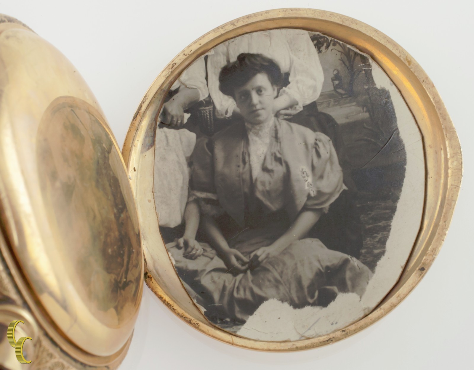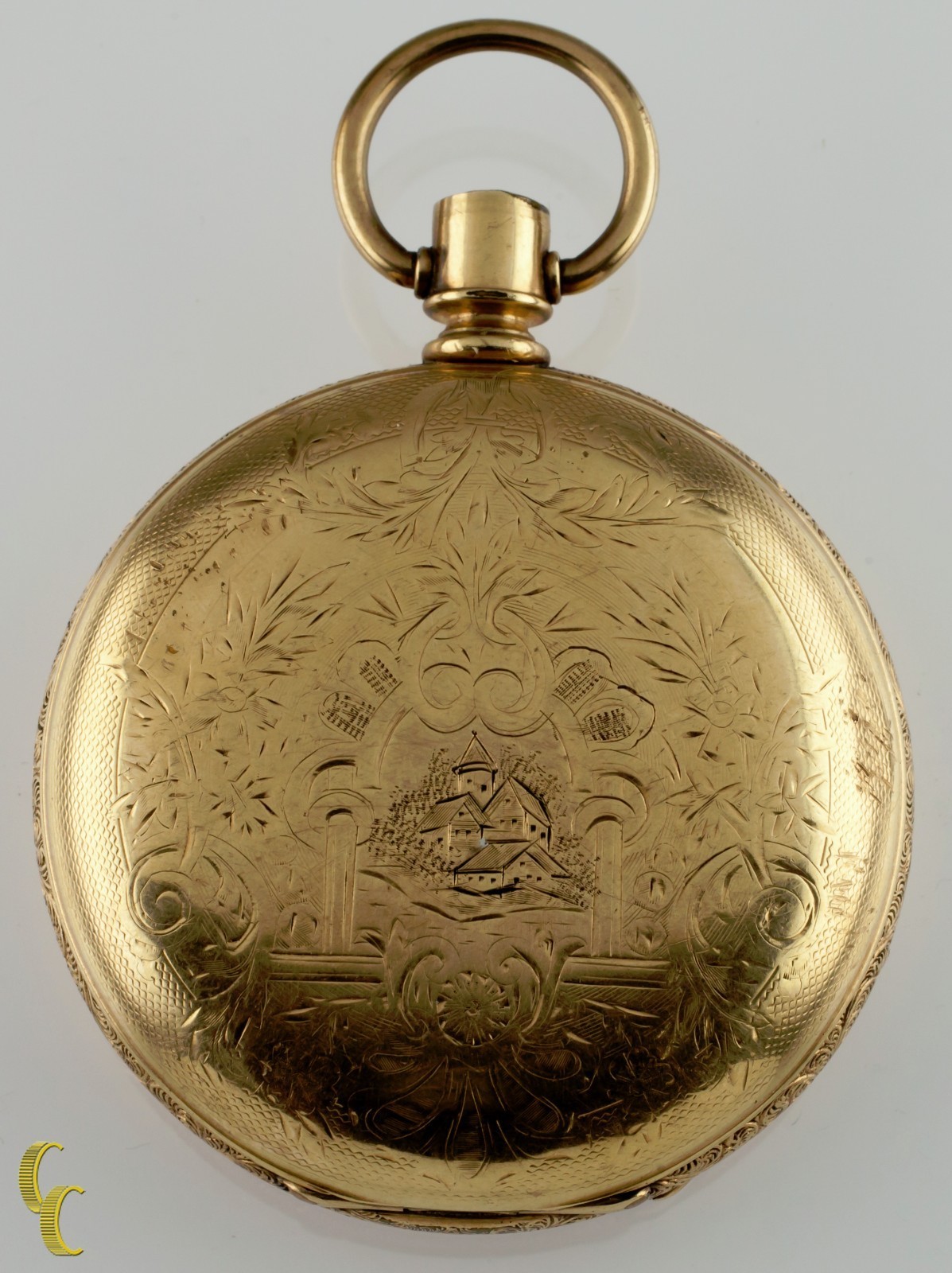 Gold Filled Case w/ Intricate Hand-Etched Pastoral Design on Front and Reverse, Guilloche on Border