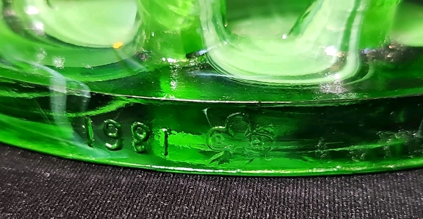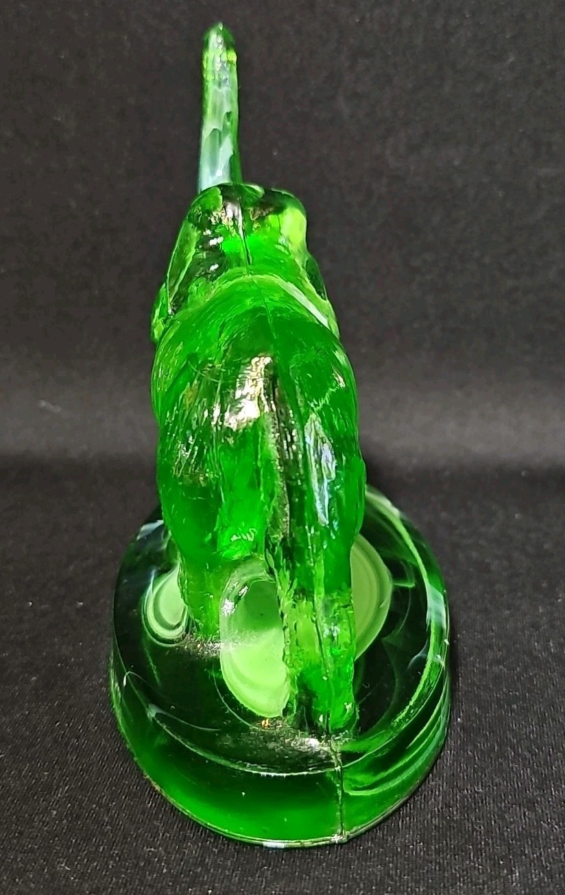 UP FOR SALE: Limited edition ?Bimbah the Elephant? art glass sculpture designed by Robert Henry of Ft. Wayne, Indiana, and pressed by Mosser Glass Co. in Cambridge, Ohio. This version, made in October 1981, features the striking Slag Green White colorway, also called Snowy Pine. Only 988 were made, with no reruns.