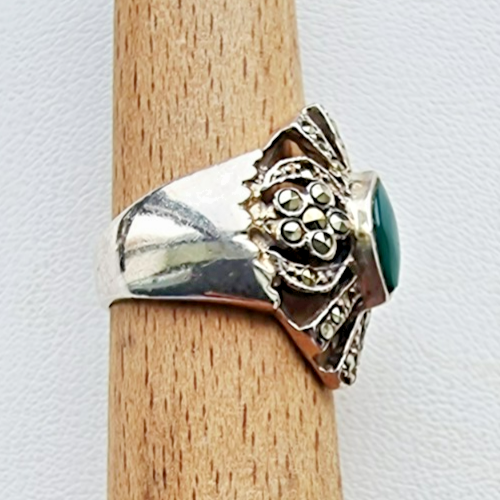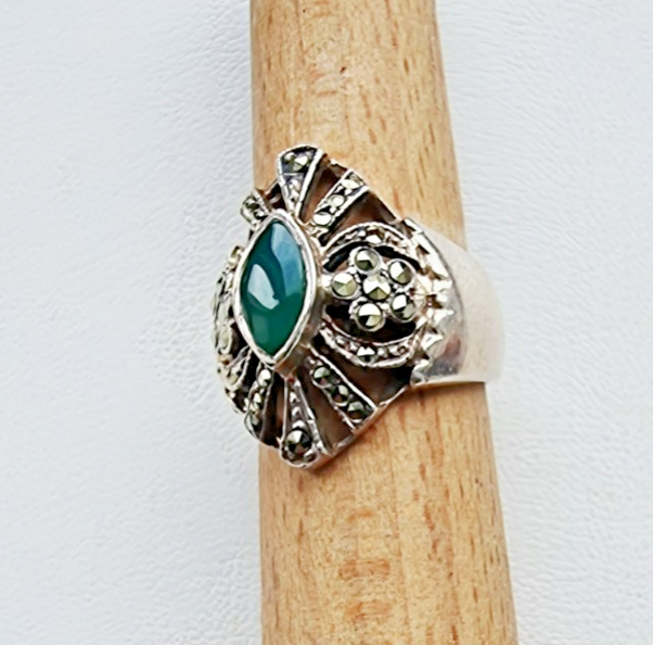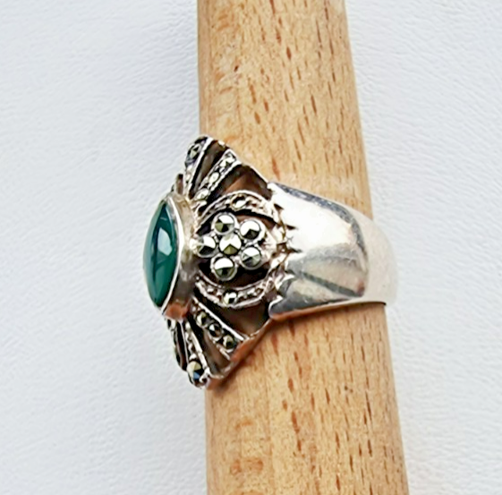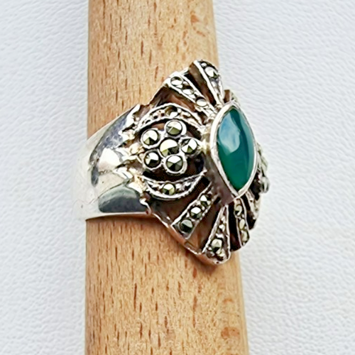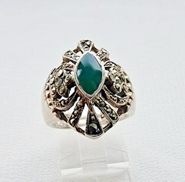 VINTAGE 925 STERLING SILVER GREEN 9x5 mm. JADE AND MARCASITE RING SIZE 6