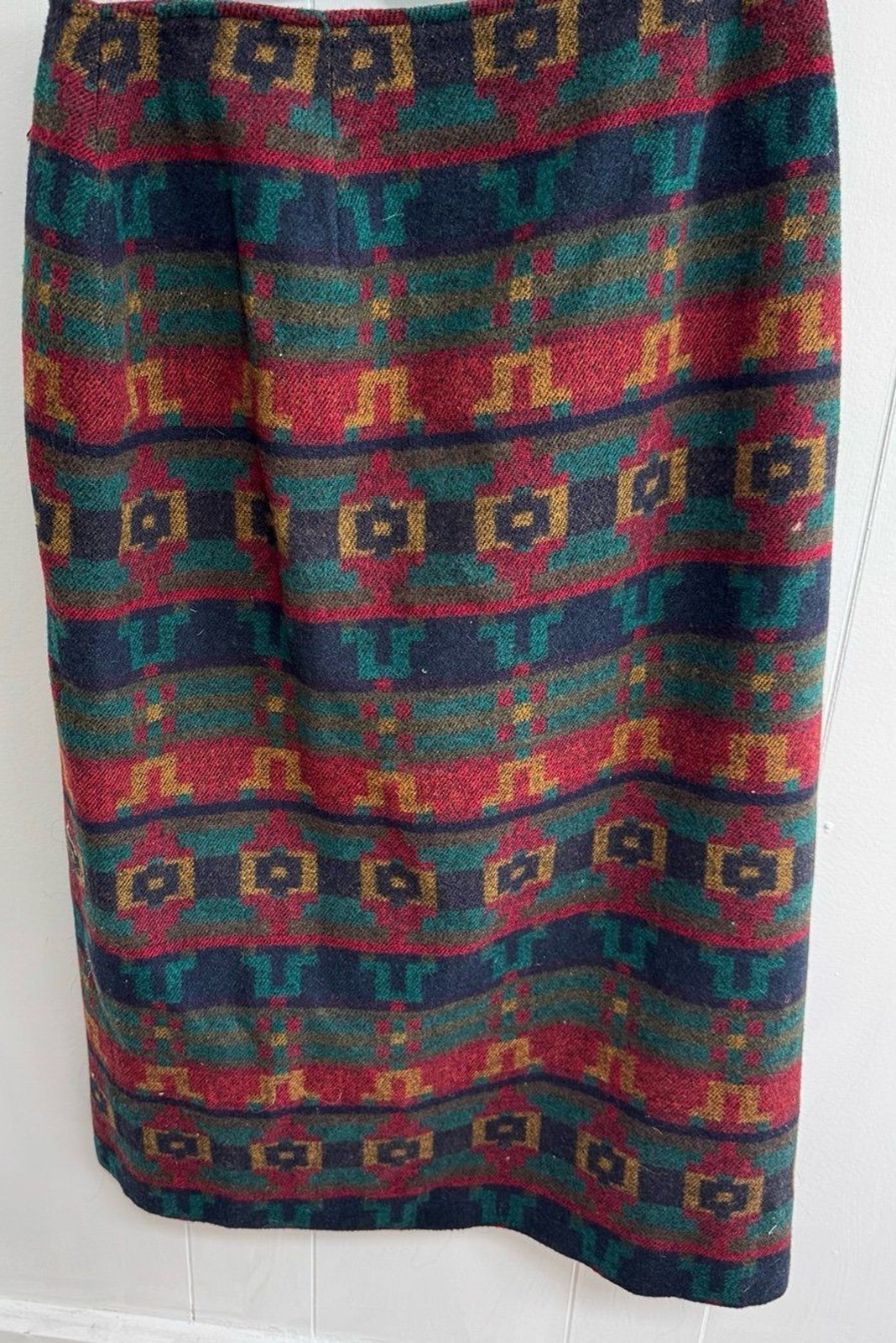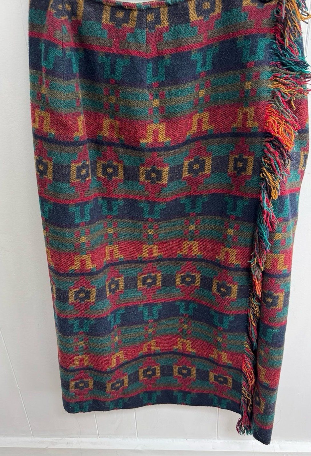 VTG Aztec Southwestern Print Wrap Skirt Fringe Wool Size 12