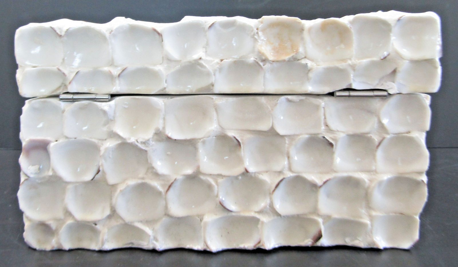 This handcrafted large white Barbuda shell hinged box features a square shape with intricate shell patterns, making it a unique and decorative collectible for any occasion. The glossy finish and original design add to its appeal, while the hinged feature makes it a functional storage option for small items. Measuring 9 inches in length, 4.75 inches in height, and 8.5 inches in width, this late 20th-century piece showcases the beauty of seashells and is sure to be a standout piece in any adult's collection.