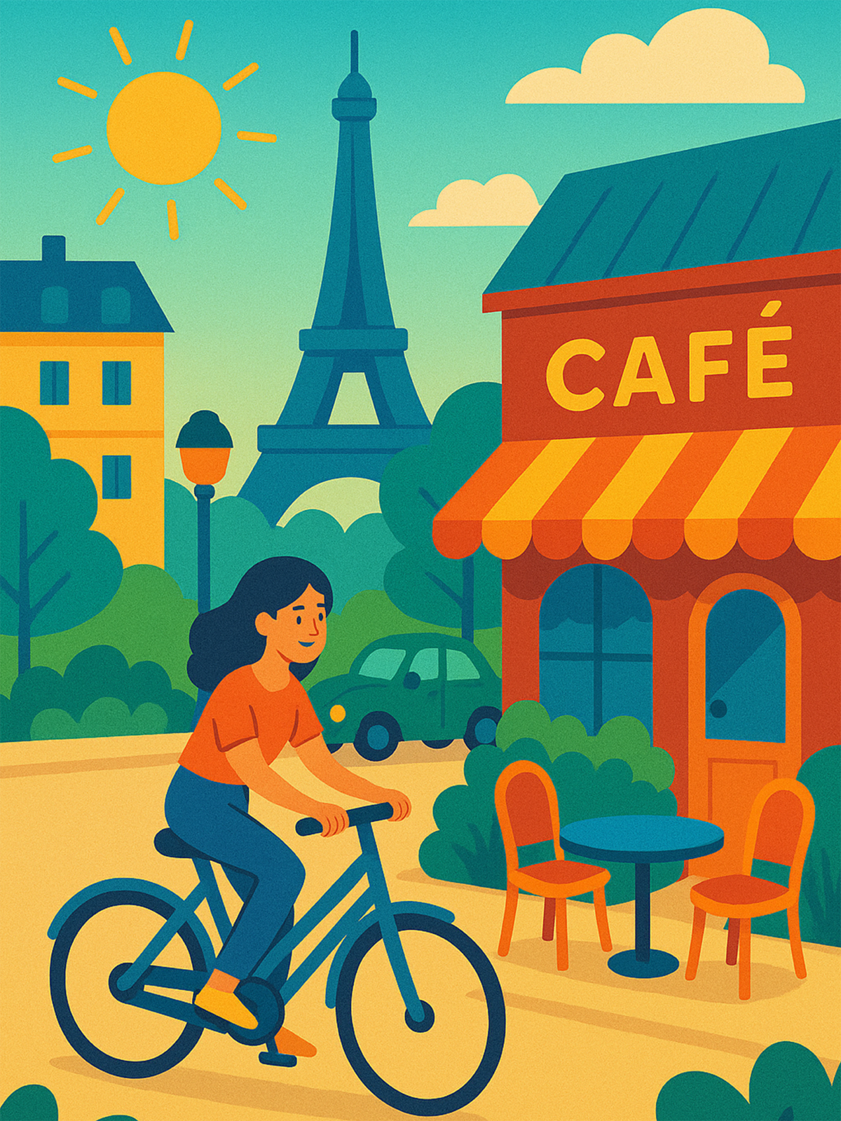 “City’s Gentle Rhythm” showcases a peaceful scenery of urban life, a streetscape full of vibrant colors with soft shapes evoking a sense of tranquility amidst the lively neighborhood. The style is simplistic that is akin to vector graphics. The colors are varied but have an overall warm tone. The piece, along with its title, is a comment to the lifestyle in the city. The lovely harmony is portrayed by the woman’s bright smile, the cafe, and the bicycle ride. Amidst the engrossed state of the city, the city’s gentle rhythm can be seen through the woman, who found herself a room for such moments, harmonizing with everything around her.