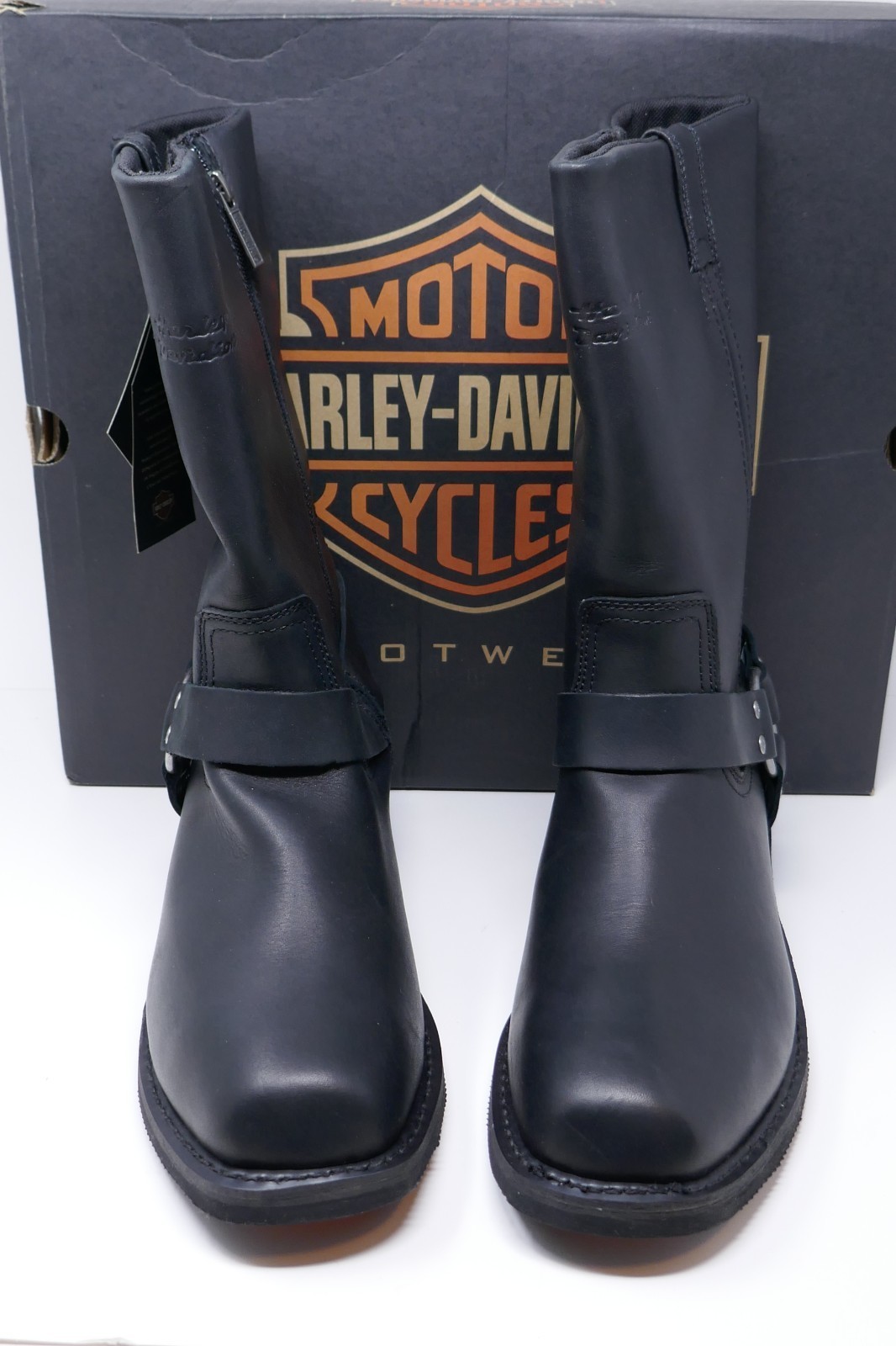 The Harley-Davidson Men's Hustin Waterproof Leather Riding Boots are perfect for biker enthusiasts looking for both style and functionality. One boot does have a small scuff. These mid-calf boots feature a square toe shape, pull-on closure, and a durable leather outsole, making them ideal for travel, casual wear, and workwear. The waterproof design and zipper accents make them practical for winter, fall, and spring seasons, while the classic black color and motorcycle theme add a touch of flair to any outfit. With the trusted Harley-Davidson brand and quality construction, these riding boots are a must-have for any rider.