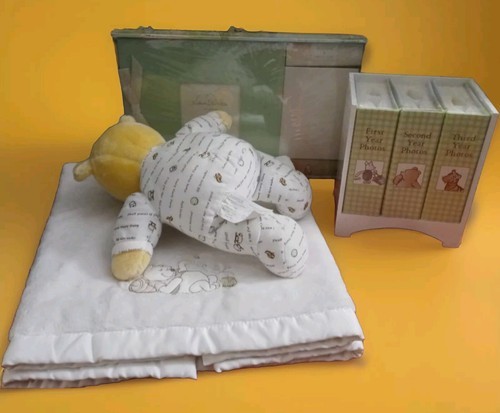 This Disney Baby Classic Winnie The Pooh 4pc Lot includes a plush blanket, album, and scrapbook perfect for any unisex nursery.