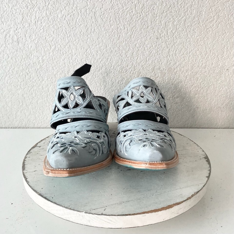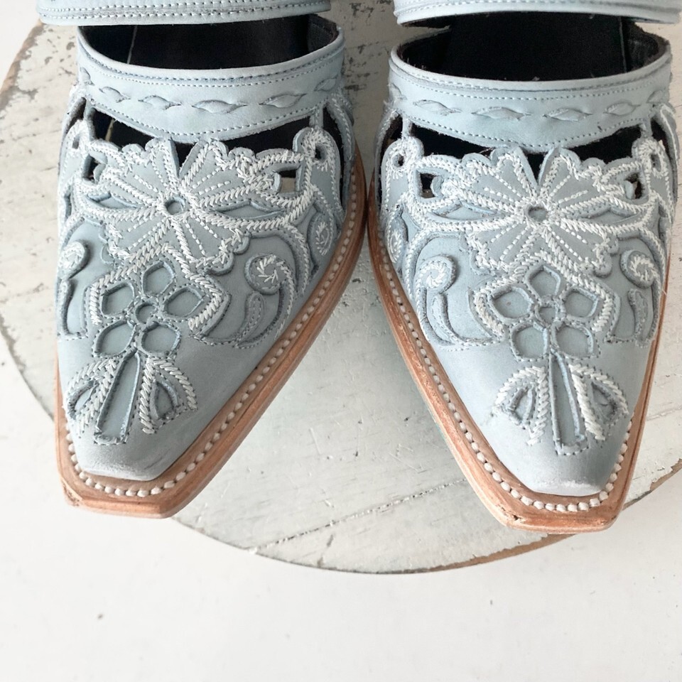 Lane SHALEY Robin Mule Womens Booties in Powder Blue Leather - Slip on Ankle Boots with a Western Pointed Snip Toe