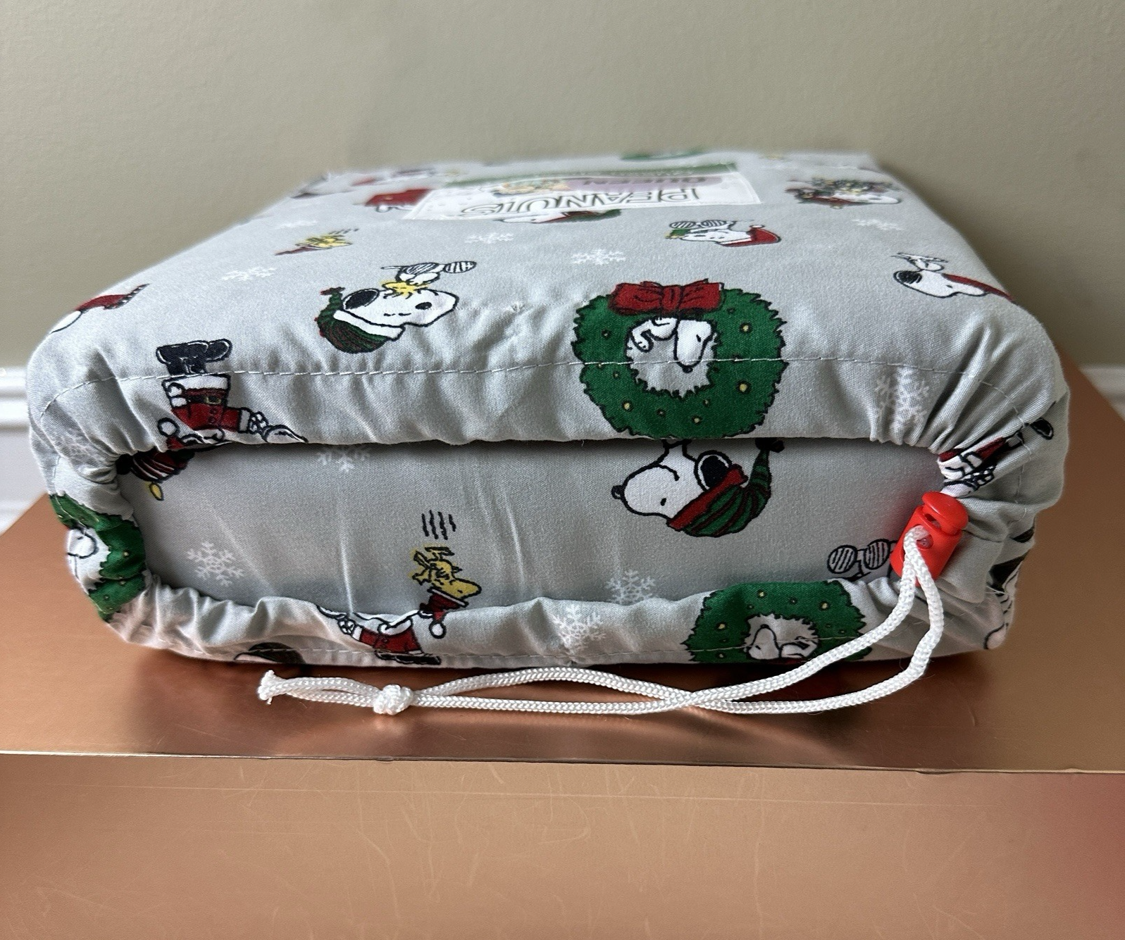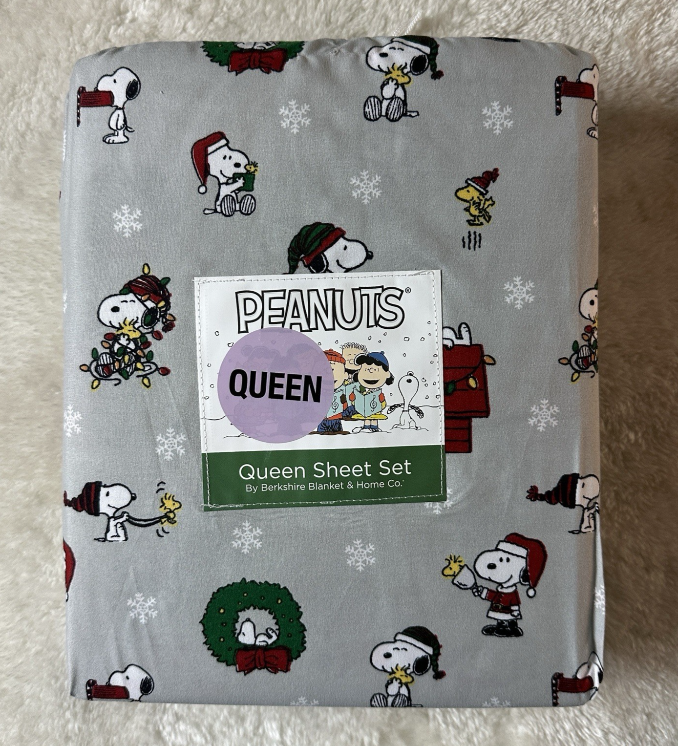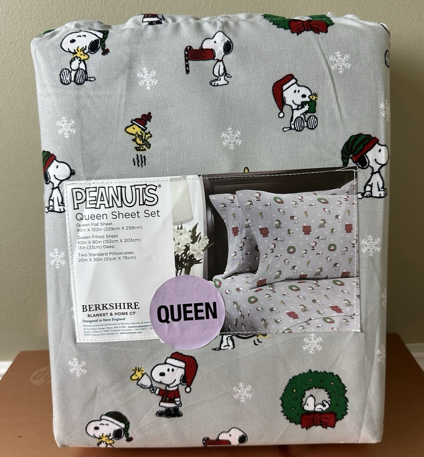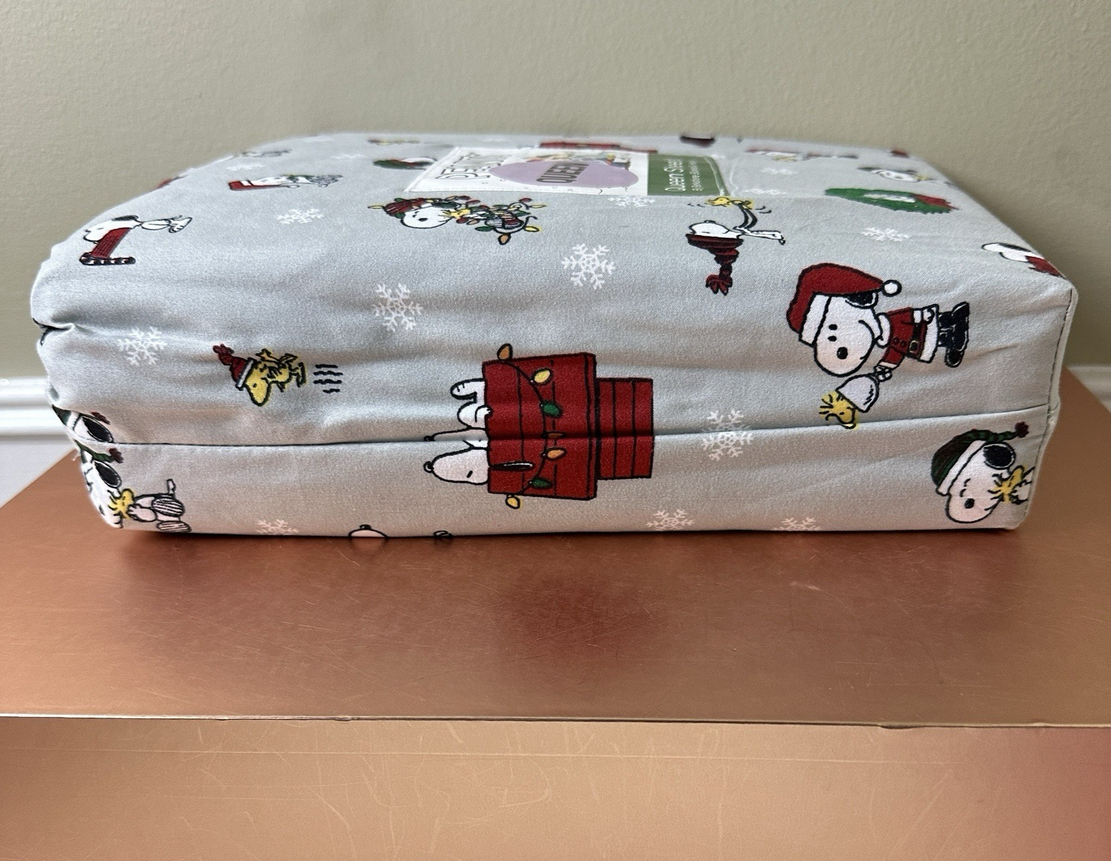 Peanuts Christmas Queen Sheet Set Snoopy Woodstock Santa Claus Wreath Lights. Gray