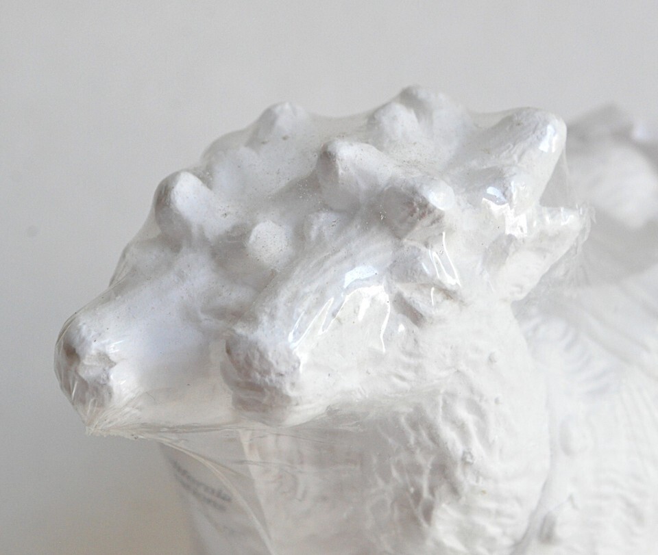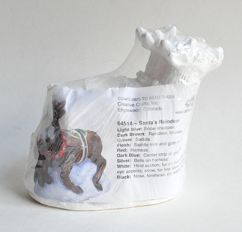 California Creations Santa's Reindeer ready-to-paint molded plaster candlestick, item 94514. Wrapped and sealed. Instructions list which color to paint each part. Holds one taper candle.