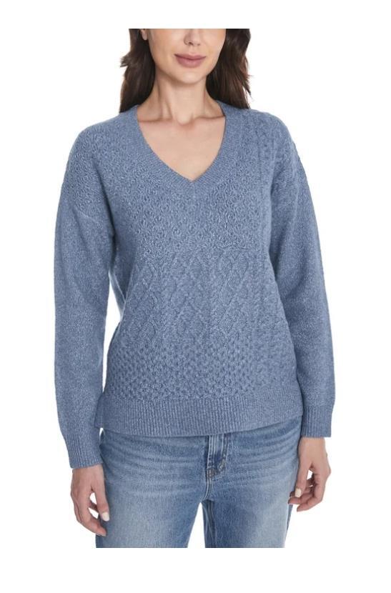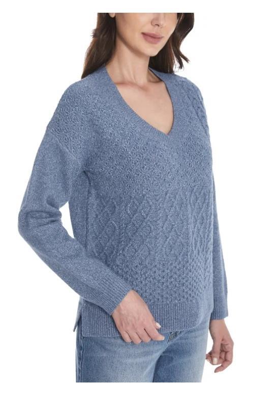 Frye Womens Sweater Blue V-Neck Long Sleeves Cable Knit Patchwork Side Slits