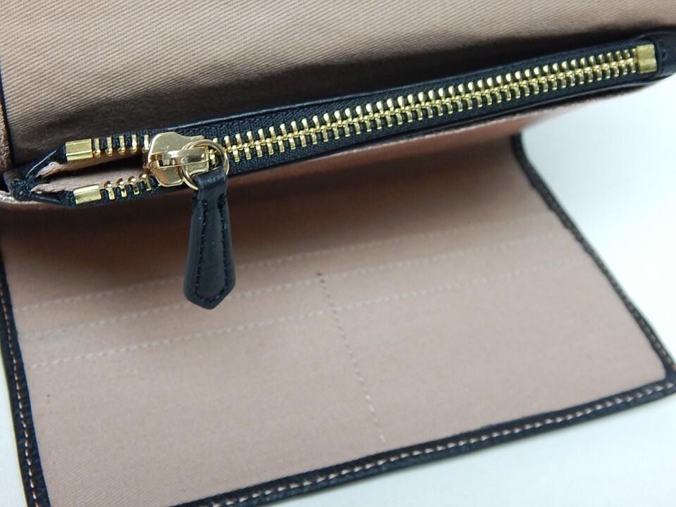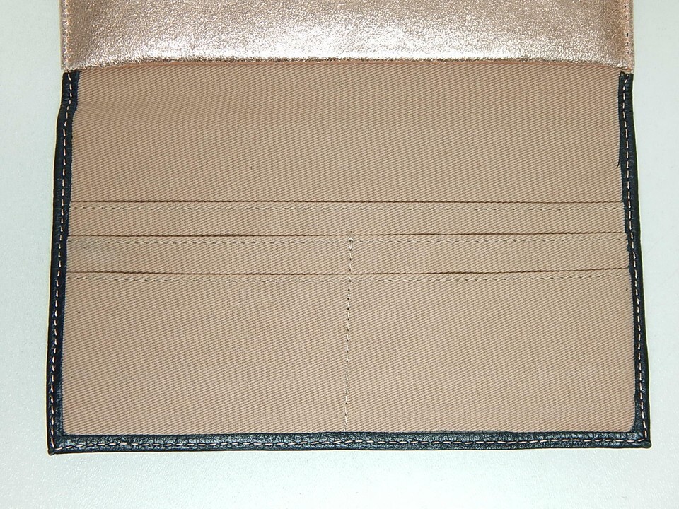Lined interior, two slip pockets, four card slots, removable zipper pouch