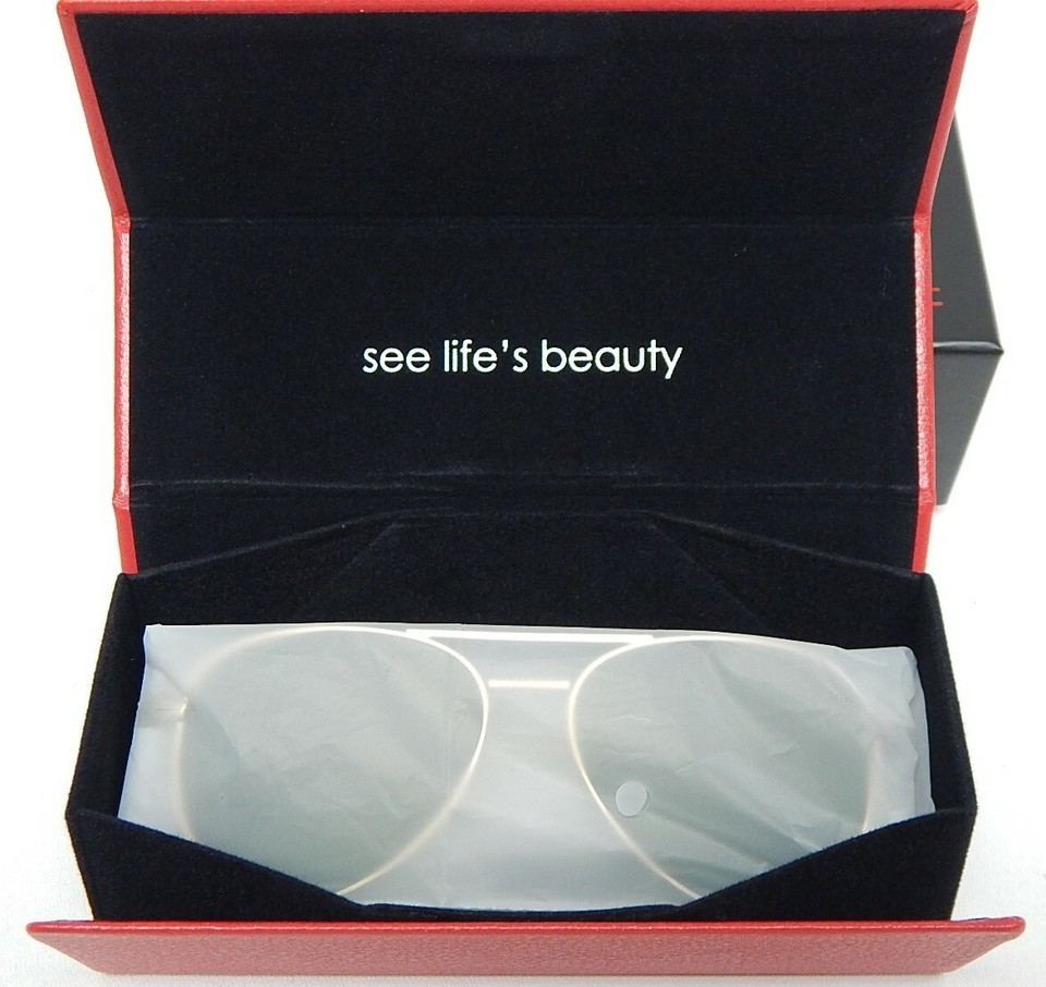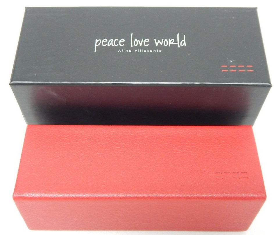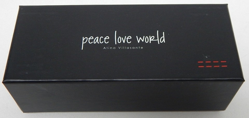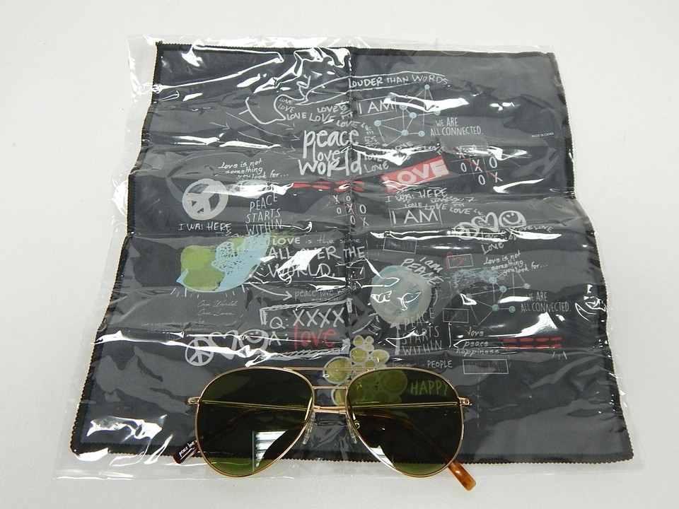 Includes aviator sunglasses, origami leather case, and microfiber cleaning cloth with Peace Love World marking
