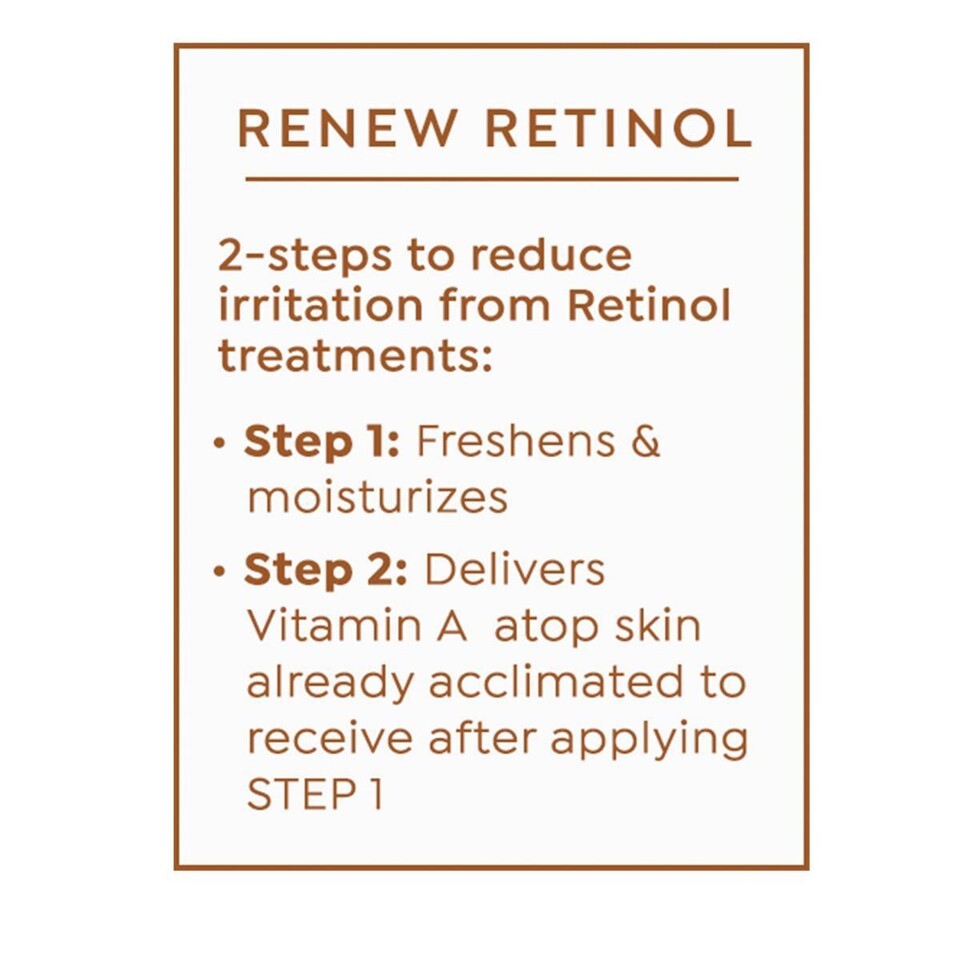 A 2-step approach designed to reduce the likelihood of irritation sometimes associated with retinol treatments: Step 1 freshens and moisturizes, and Step 2 delivers Vitamin A (retinol) atop skin already acclimated to receive after applying Step 1