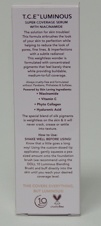 The Doll 10 T.C.E Super Coverage Serum in Tan (1 fl oz / 30ml) is a hybrid foundation-serum designed to provide full coverage while nourishing the skin. Infused with niacinamide, hyaluronic acid, and collagen, this formula aims to reduce the appearance of pores, fine lines, and redness, delivering a smooth, radiant finish.