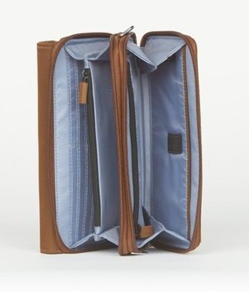 Lined interior, 16 card slots with RFID protection, clear ID window, bill sleeves, zip coin pocket, pen holder loop