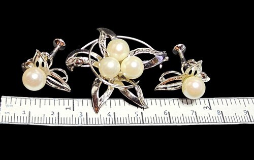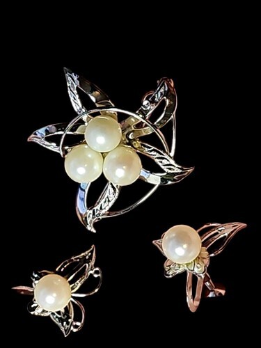 UP FOR SALE: Cluster Leaf Silver Saltwater Akoya Pearl Brooch Earring Set Vintage Butterfly
