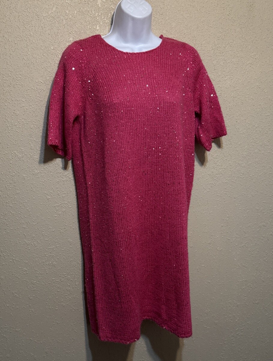 Shimmering sequins highlight a soft knit sweater-dress fashioned with a dipped V-NECK and abbreviated sleeves.