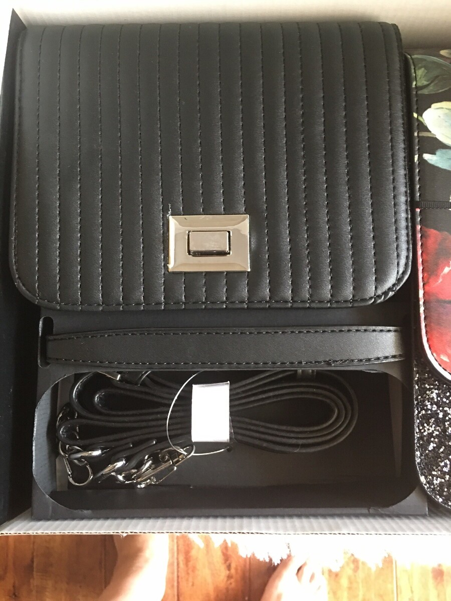 Flaps are black quilted stripe, black floral and black glitter. All have silver hardware