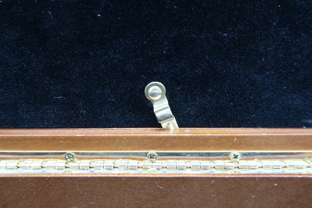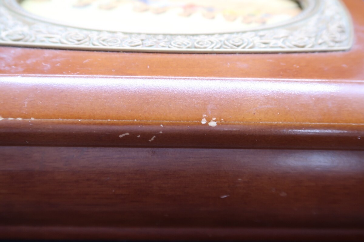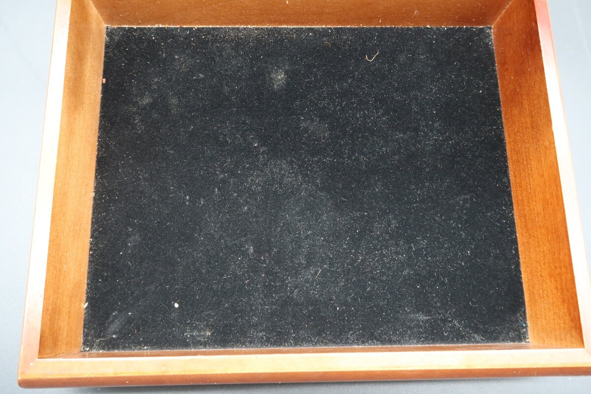 A nice wooden box with some scratches and scuffs. The photograph comes with it but is a modern card, slides out for your own memory. There is no glass in front of the picture it is a plastic protector. You could have a small piece of glass cut if you choose. Lots of pictures to see the condition. The box is lined inside.