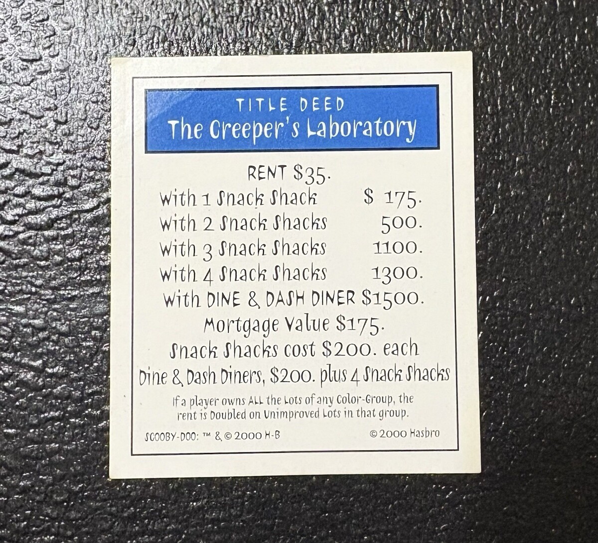 Monopoly Scooby-Doo Collectors Ed. Part: Title Deed - The Creeper’s Laboratory