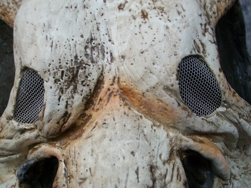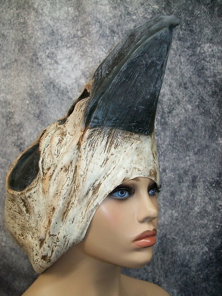 Crow Skull Costume Mask. Has a textured bone look. Nice Detail. Made of Latex. Beware if you have an allergy to latex. Has an elastic band in the interior. Elastic Strap Does Not adjust. May require lightweight stuffing to maintain shape or aid in wear. Mask has a plastic insert for display and storage purposes. Insert will need to be removed prior to wear. DOES NOT INCLUDE MANNEQUIN.