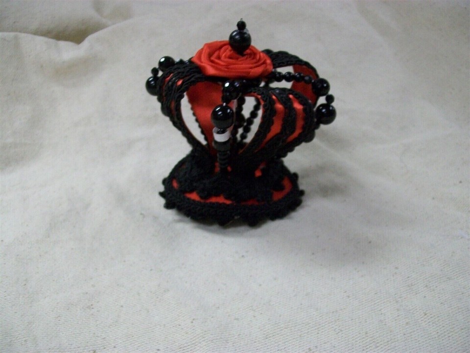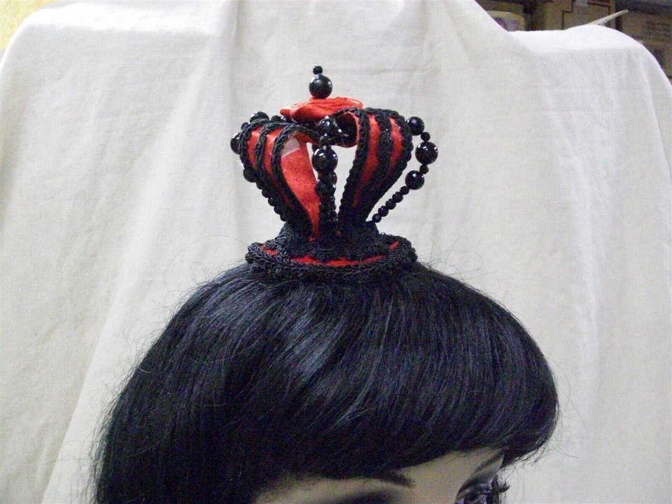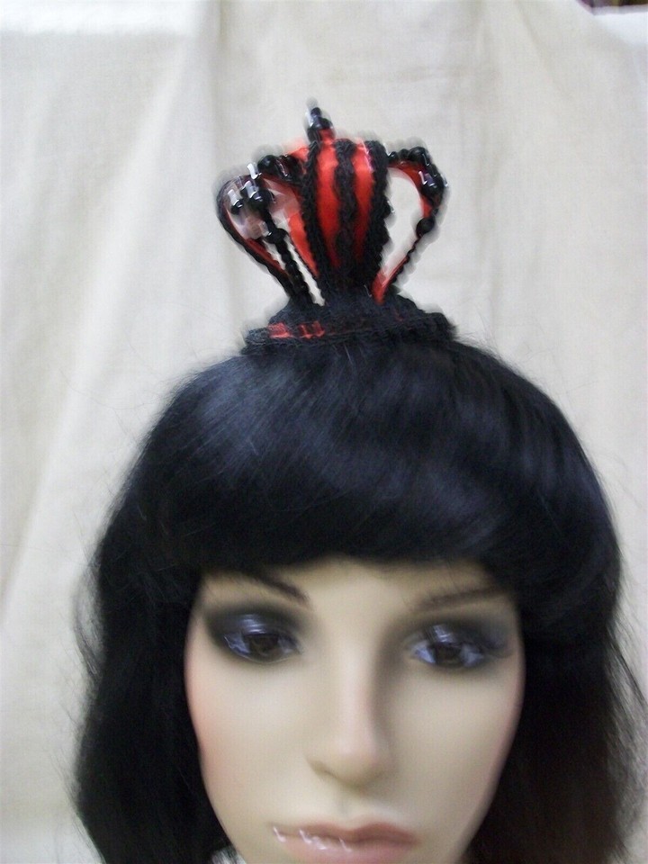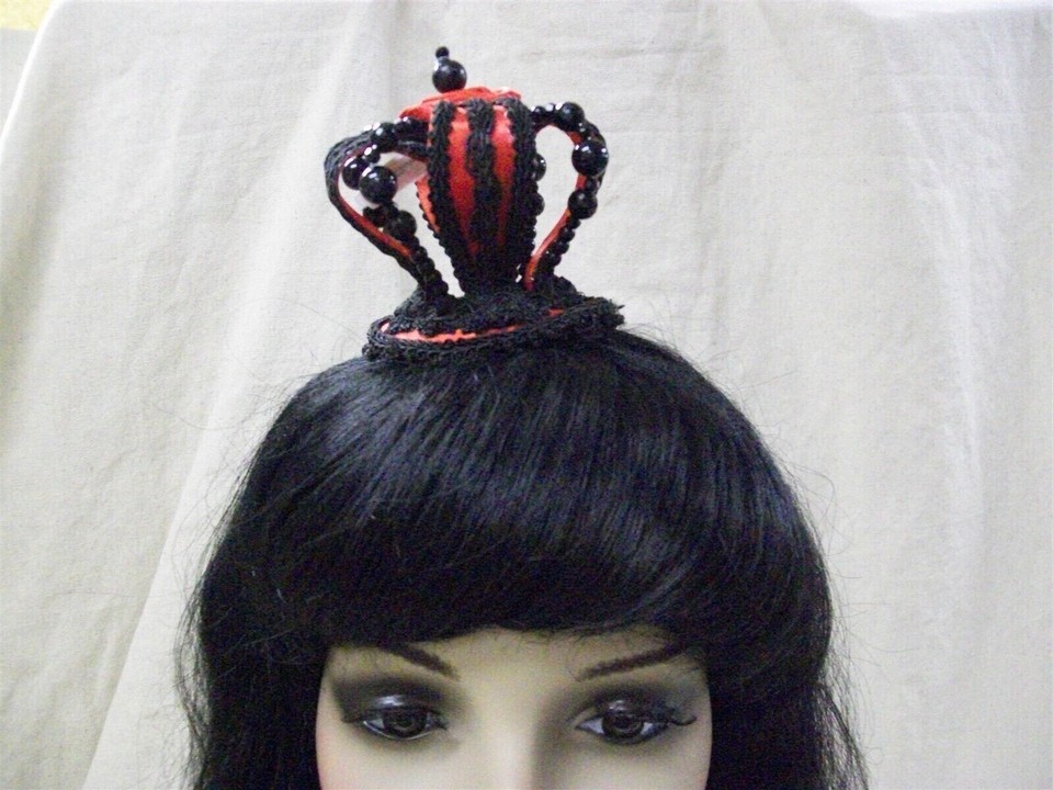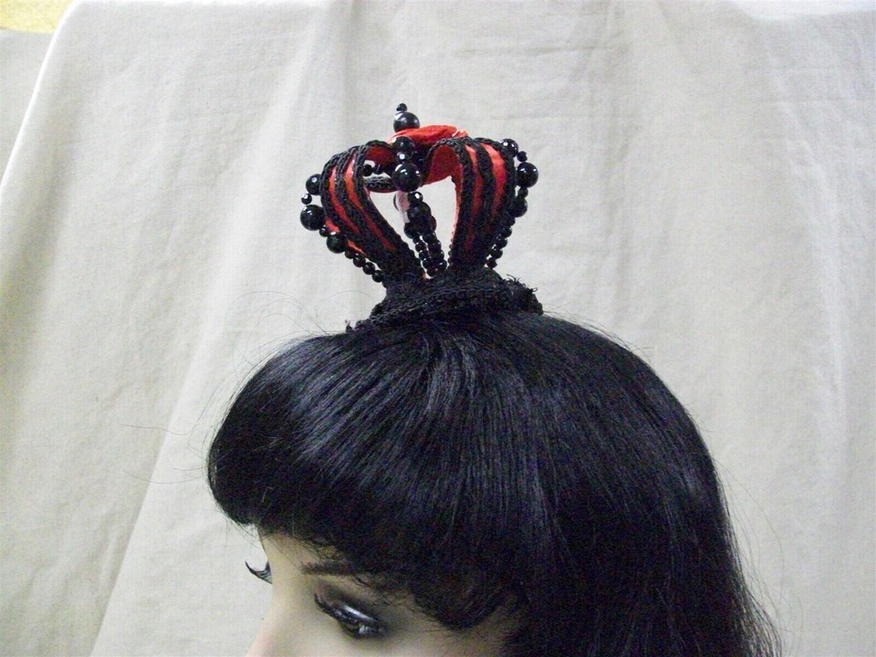 Wicked Gothic Mini Queen Costume Crown.This is a small / mini crown. Gothic Red and Black Black Beaded detail and Fancy trimmings. Has two clips on the bottom to clip onto your natural hair to secure in place. Can be worn to the side or on top. Could be used as an accessory with many costumes. DOES NOT INCLUDE WIG.