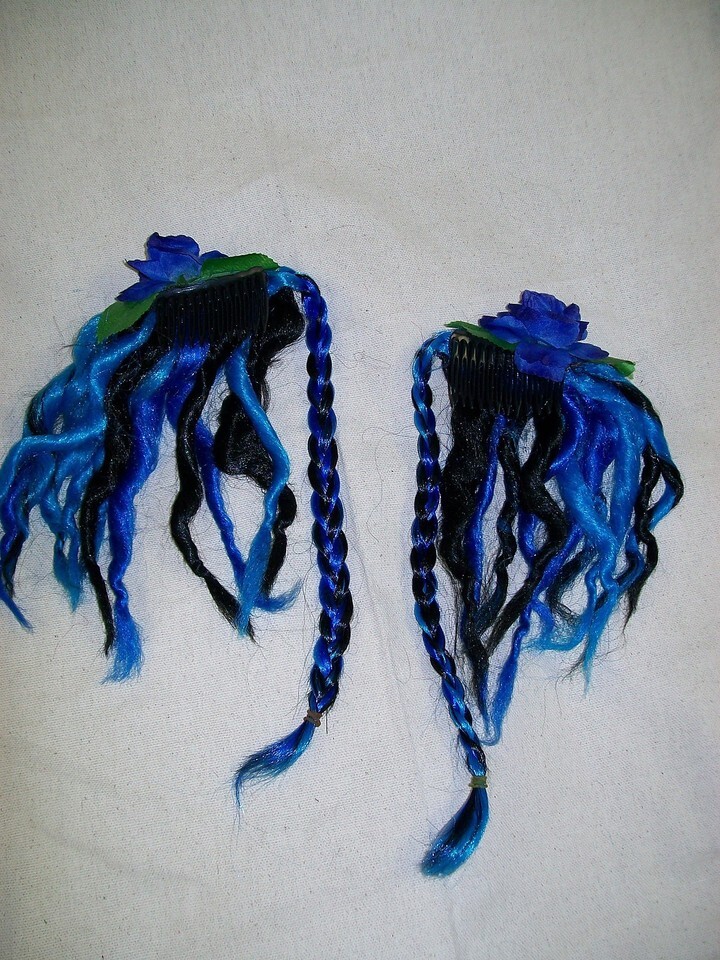 BLUE THEME: Hair color is a mix with a darker blue, lighter blue, and black. Curly dreads with a longer braid and flower accent near the comb