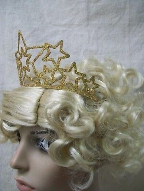 Fancy Gold Star Cluster Costume Tiara / Crown. Made of thin metal. Flexible Tiara can be carefully bent/shaped to fit head size. Gold Glittered on the front. Glitter does shed. Has plastic hair combs that can be put on the ends to help secure wear (if desired). Could be used with costumes such as listed below: For Adult Use - Not intended for children. Unisex could be worn by Female or Male.