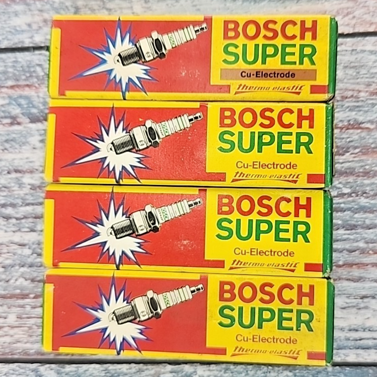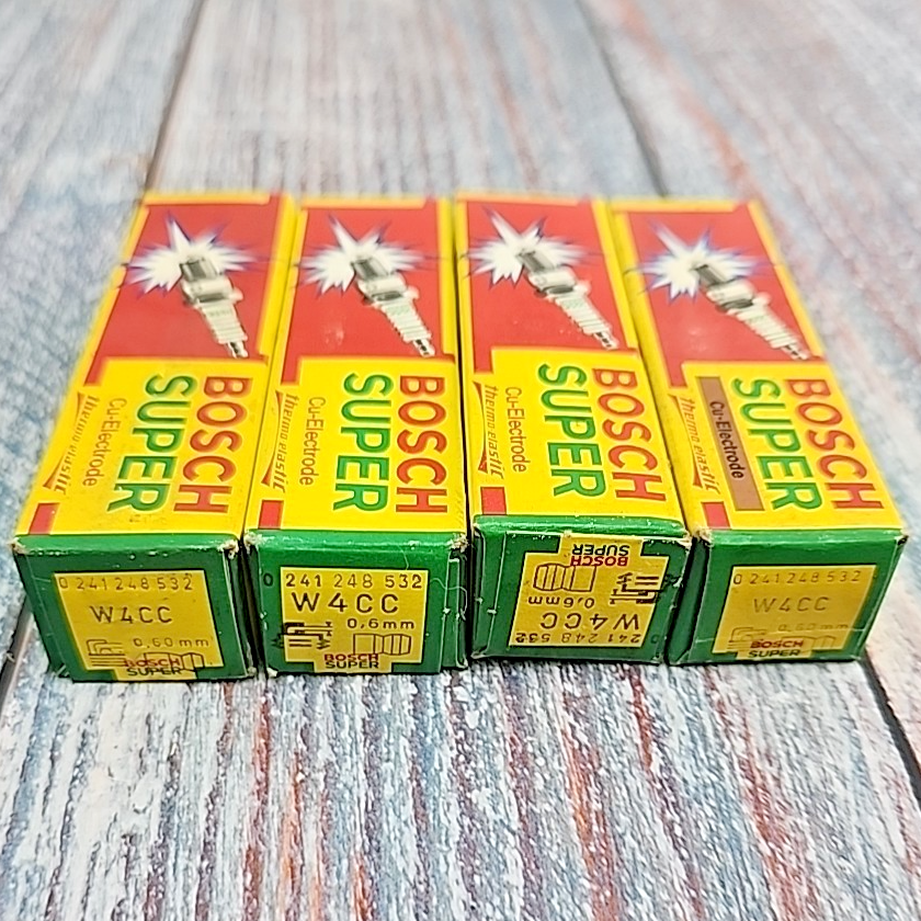 The product is a set of 4 Bosch Super W4CC spark plugs designed to fit Porsche and Jaguar vehicles. These copper spark plugs have a 14mm thread diameter, standard configuration, and a 0.70mm gap. Manufactured in Germany, they are performance parts suitable for gasoline engines. With a voltage of 12V and an installation depth of 19mm, these spark plugs offer high-quality ignition for vintage vehicles. Bosch is a trusted brand known for producing reliable automotive components, making these spark plugs a valuable addition to any car or truck.
