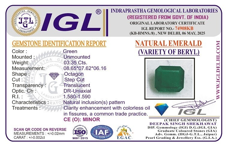 Emerald / Panna - Zambian - 3.35 carats - IGL Certified