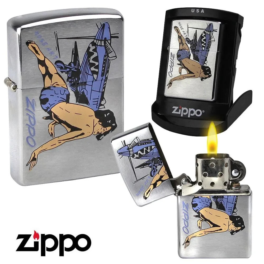The product is a rare 2008 Zippo lighter featuring a unique nose art design of a blue dress pin-up girl. Made in the United States, this collectible item appeals to enthusiasts of Zippo lighters and vintage tobacciana. The distinctive artwork on the lighter makes it a sought-after piece for collectors looking for unique and limited edition pieces in the world of smoking accessories.