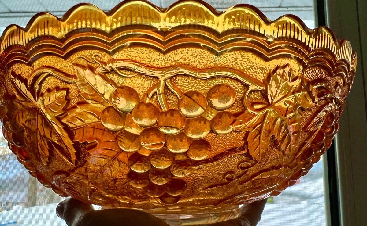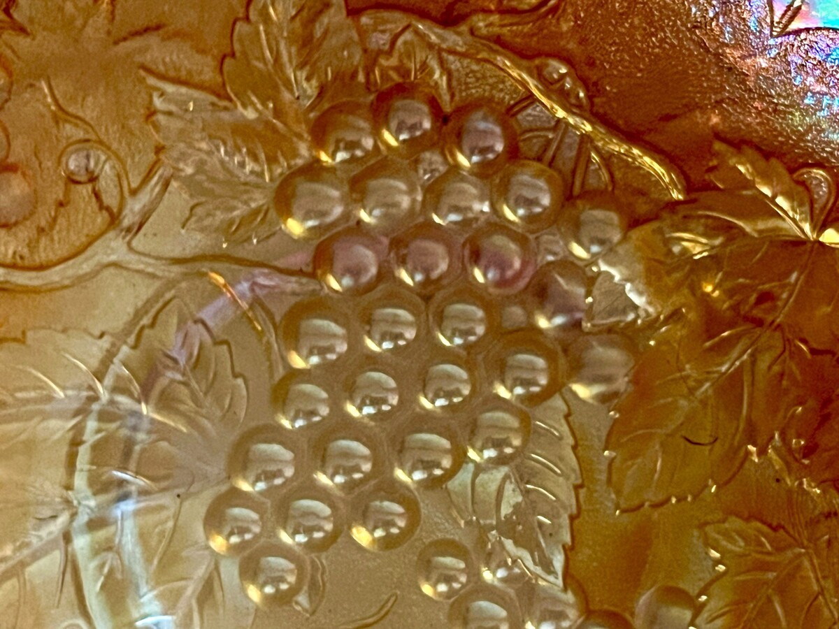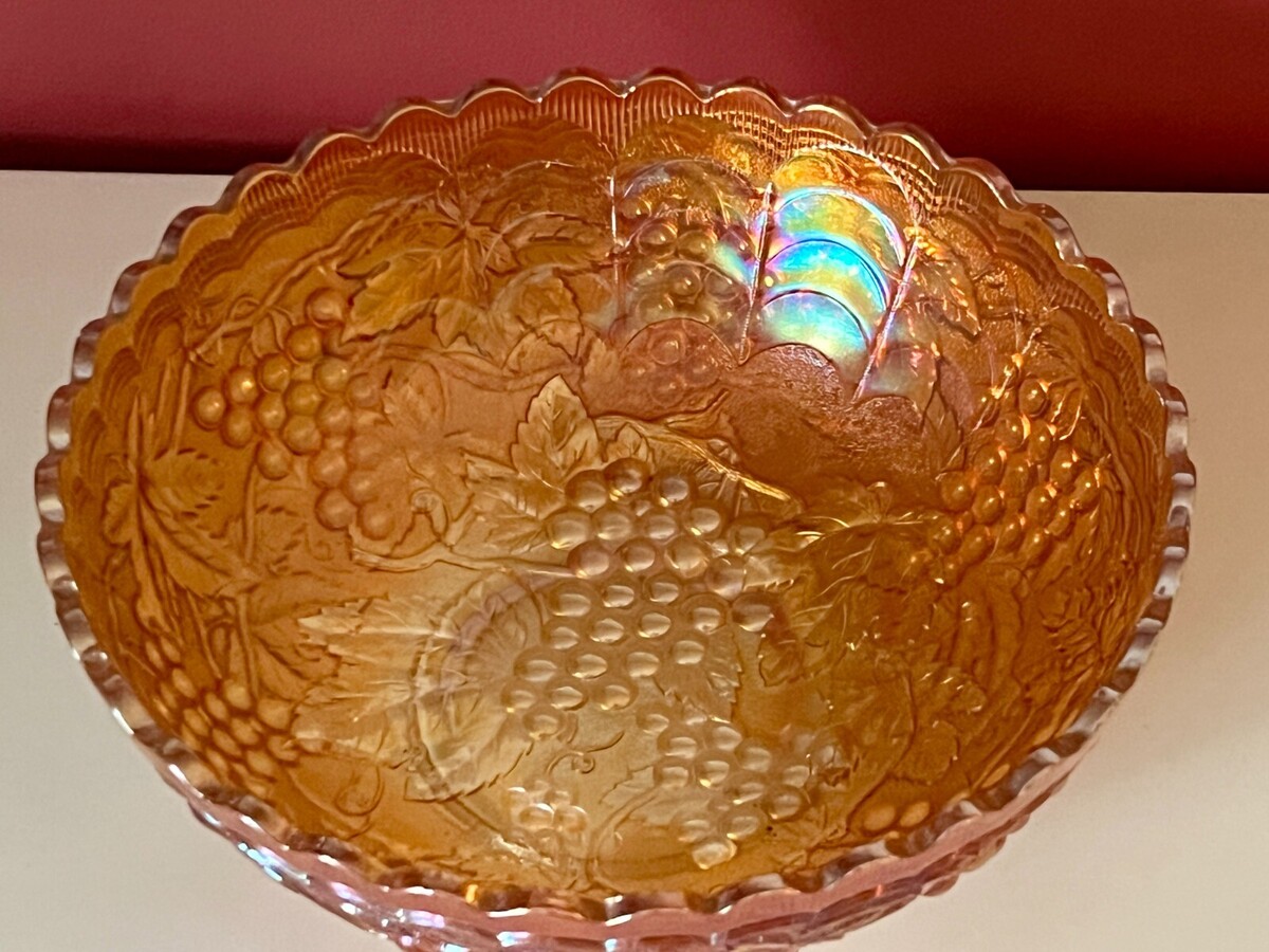 Very pretty bowl, 9" in diameter, in a pattern I am not familiar with. Excellent condition, no chips or cracks. he raised grape pattern in raised on the inside bottom, and the outside of the bowl sides. It has an orange/pink iridescence.