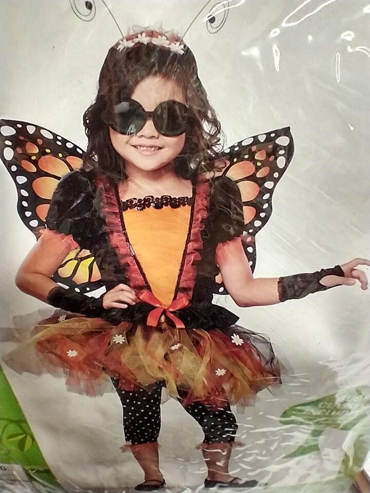 Super Cute Sassy Monarch Butterfly Themed Costume. Ages 4 and up. Size Chart in Photos and Below. Antenna Ends on headband are metal and will require some gentle shaping for desired look. DOES NOT INCLUDE WIG / HAIR or SHOES.
