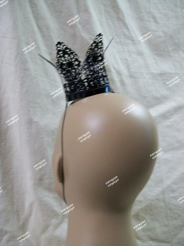 Mini Black Twisted Scrolled Embossed Metal Crown. Fancy Renaissance Medieval Costume Crown / Tiara / Headpiece. Adult: One size fits Most. No age specs but most costume items are intended for ages over 14. Metal can be carefully bent if desired and may require some slight shaping. Tips are flared outwards. Crown has an elastic cord. Could be used by Male or Female. Measures approx. 9.25" round at base. The height is approx. 3.25" from base to tips. (Measurement taken at longest point) DOES NOT INCLUDE MANNEQUIN.