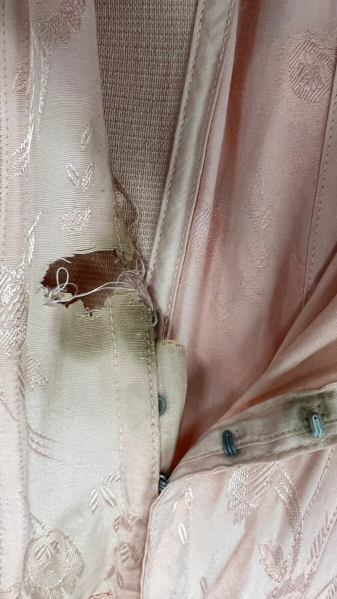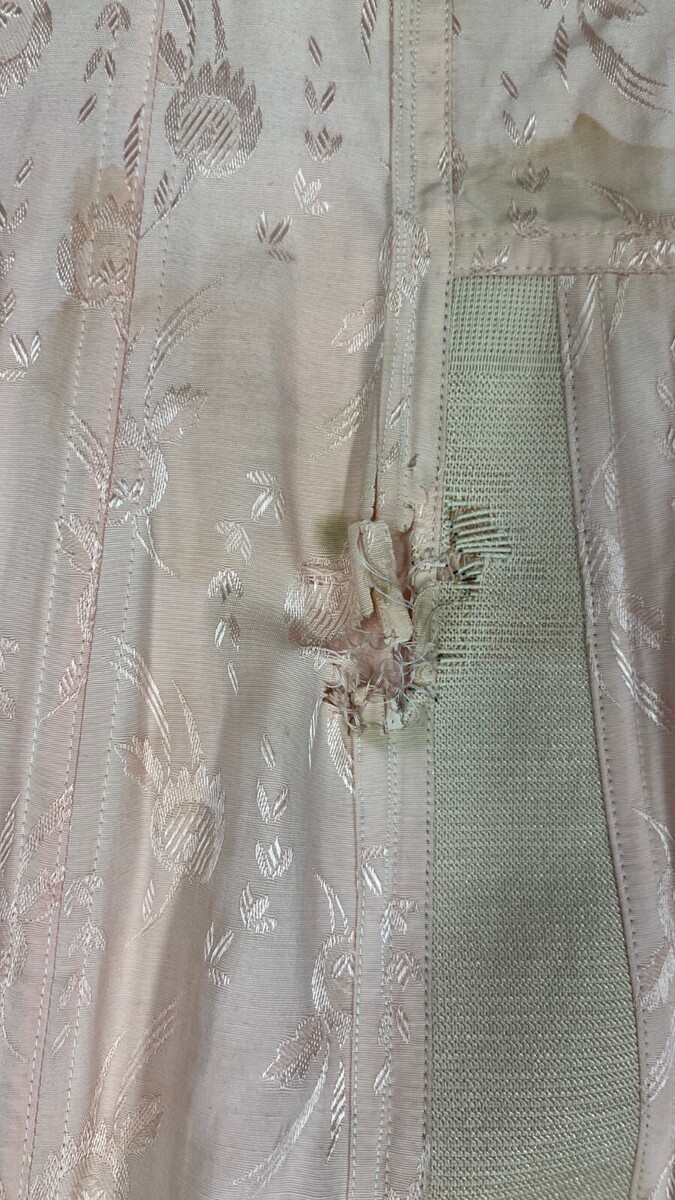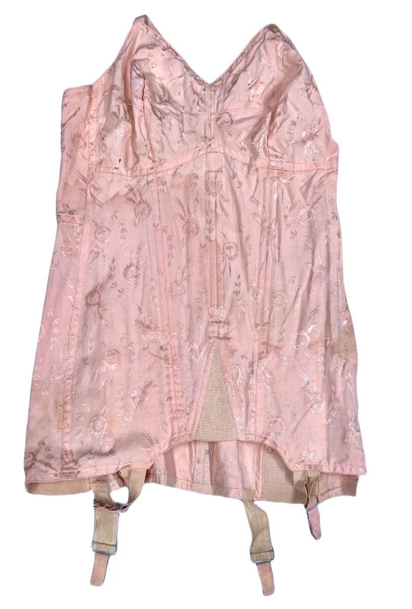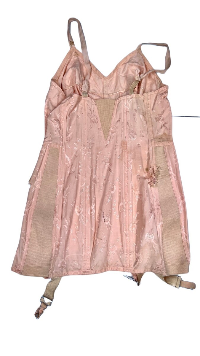 Vtg Lady-Lyke OB Open Bottom Corset Girdle Brocade 36 CORSELETTE 4 Garters Pink in stained and well worn-well loved condition. Also, I think a mouse chewed through it in one spot as shown. As found. Hooks on side and inside. The size is printed on the boning, 36., Peach floral brocade. Wire-free cups. 4 attached metal garters. Hook and eye closure as well as inside. NON-adjustable straps. Cotton and rayon.
