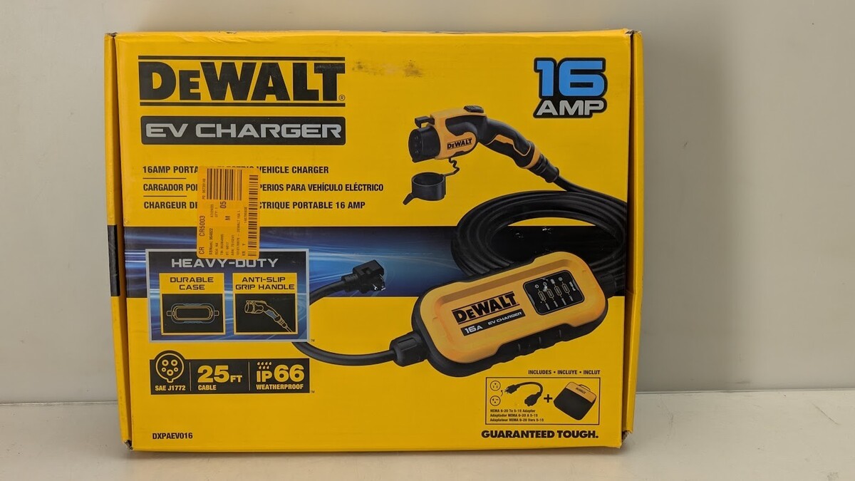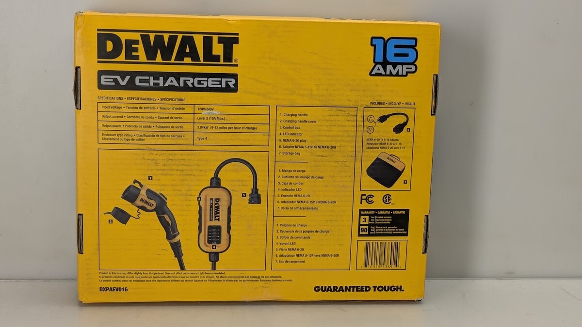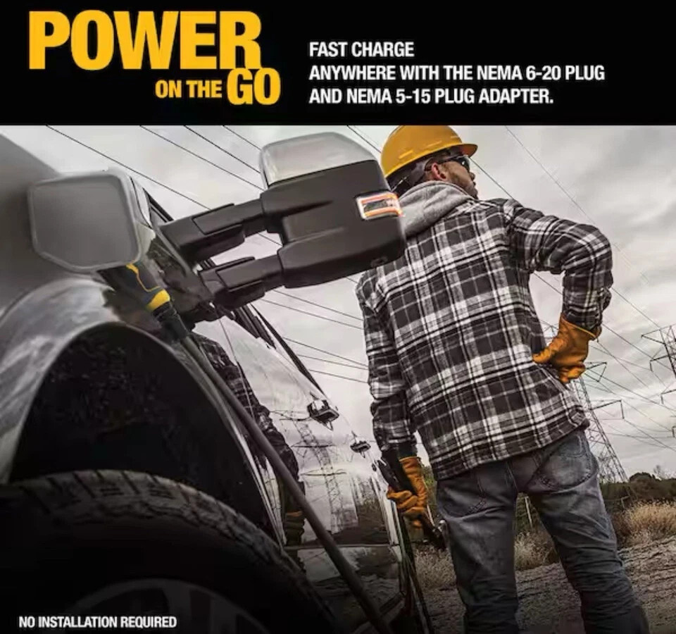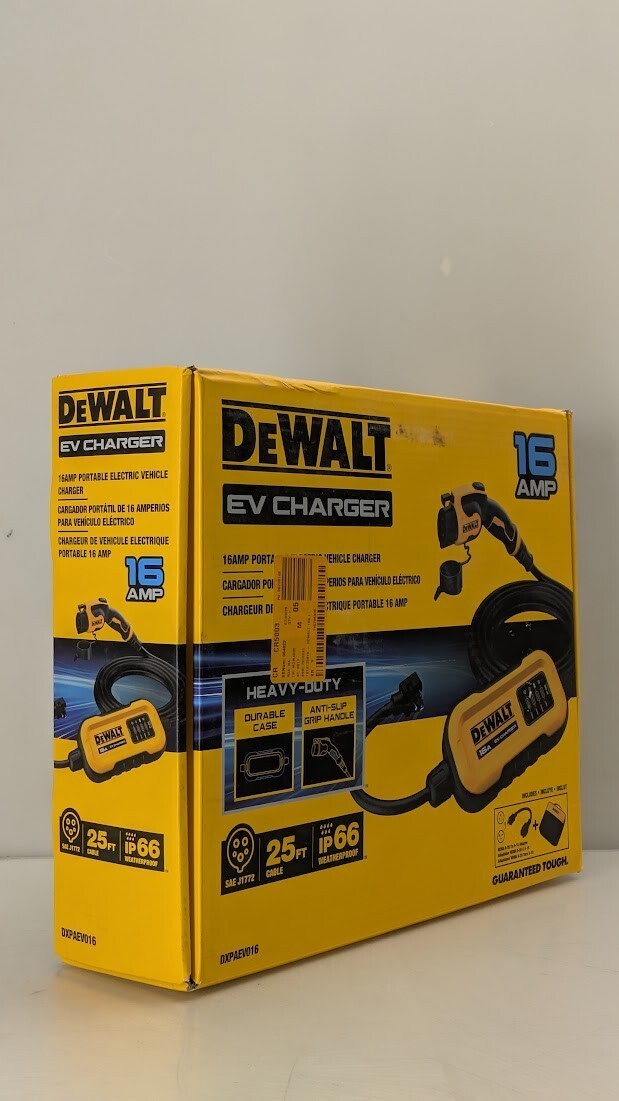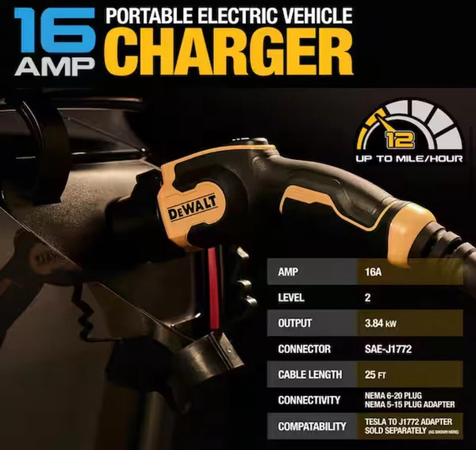Power on-the-go. introducing the DEWALT level 1/ level 2 portable electric vehicle charger, delivering between 12 to 16 Amps up to 3.84 kW of knockout power, charge up to 12 miles per hour, compatible with all SAE J1772 electric vehicles, confidently charge into the future at home or on the road with DEWALT by your side, this charger includes a NEMA 6-20 plug and interchangeable NEMA 5-15 adapter, experience the convenience and freedom of our portable EV charger with the widely compatible NEMA 5-15 adapter, with the ability to charge anywhere there is a common household outlet, the world is your playground, when not in use, store your portable charger in the included travel bag for safe keeping, built tough, this EV charger comes with the durability and safety you'd expect from DEWALT, premium materials and a smart design are brought to life with the heavy-duty protective cage, 25 ft. high-grade UL certified cable and anti-slip grip charging handle. CSA certified, this EV charger is rated for indoor and outdoor use with IP66 waterproof rating and contains over 10 technologically advanced safety features including overvoltage, overcurrent, overheat, overcharge and surge protection, the DEWALT portable EV charger is ready to use right out of the box with no installation required.