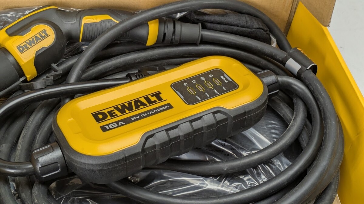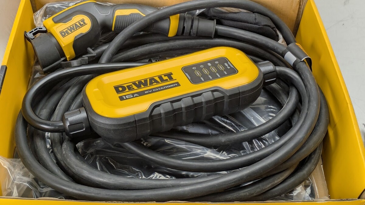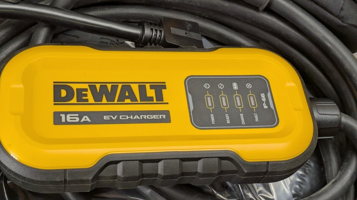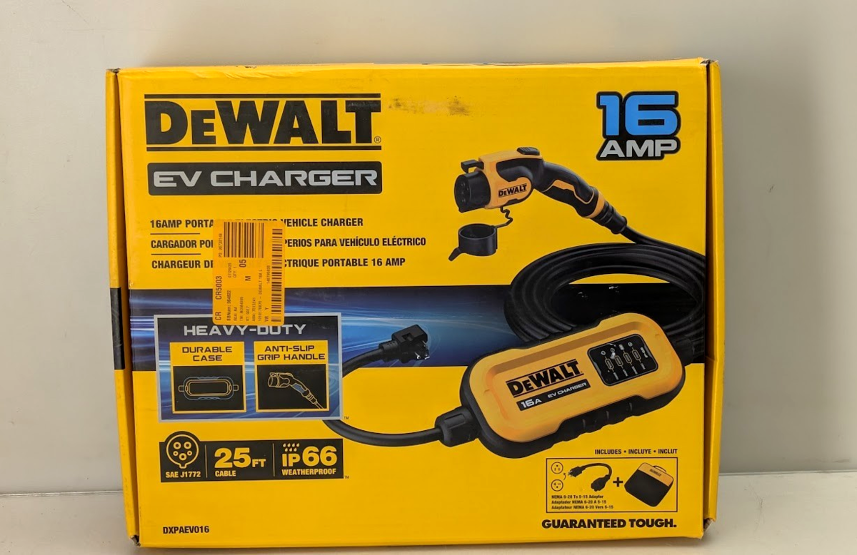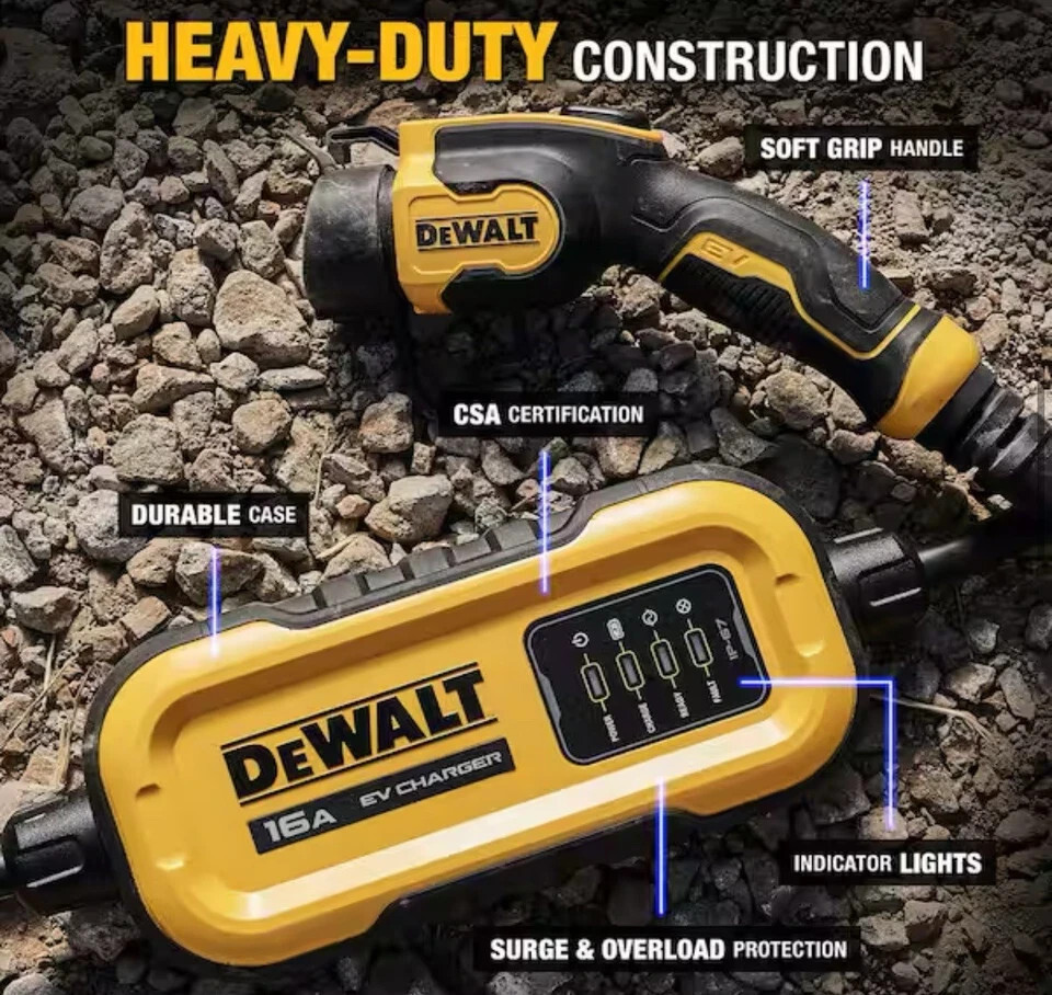 Power on-the-go. introducing the DEWALT level 1/ level 2 portable electric vehicle charger, delivering between 12 to 16 Amps up to 3.84 kW of knockout power, charge up to 12 miles per hour, compatible with all SAE J1772 electric vehicles, confidently charge into the future at home or on the road with DEWALT by your side, this charger includes a NEMA 6-20 plug and interchangeable NEMA 5-15 adapter, experience the convenience and freedom of our portable EV charger with the widely compatible NEMA 5-15 adapter, with the ability to charge anywhere there is a common household outlet, the world is your playground, when not in use, store your portable charger in the included travel bag for safe keeping, built tough, this EV charger comes with the durability and safety you'd expect from DEWALT, premium materials and a smart design are brought to life with the heavy-duty protective cage, 25 ft. high-grade UL certified cable and anti-slip grip charging handle. CSA certified, this EV charger is rated for indoor and outdoor use with IP66 waterproof rating and contains over 10 technologically advanced safety features including overvoltage, overcurrent, overheat, overcharge and surge protection, the DEWALT portable EV charger is ready to use right out of the box with no installation required.