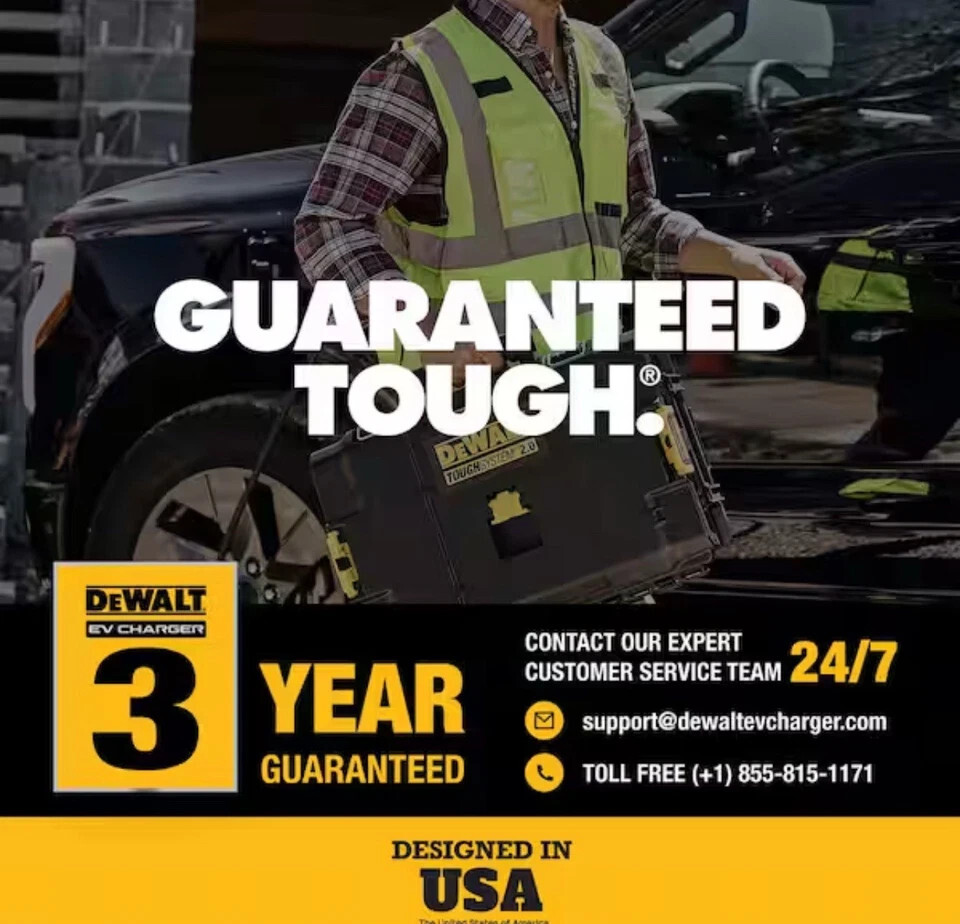 Durable Construction: Built to last, the DEWALT EV charger is designed by our team in the U.S.A. and features a heavy-duty protective cage, keeping your charger safe from scratches and dents from any rough environment. The charging gun has been thoughtfully engineered with a rubber anti-slip grip to resist any impact while maintaining a comfortable charging experience.