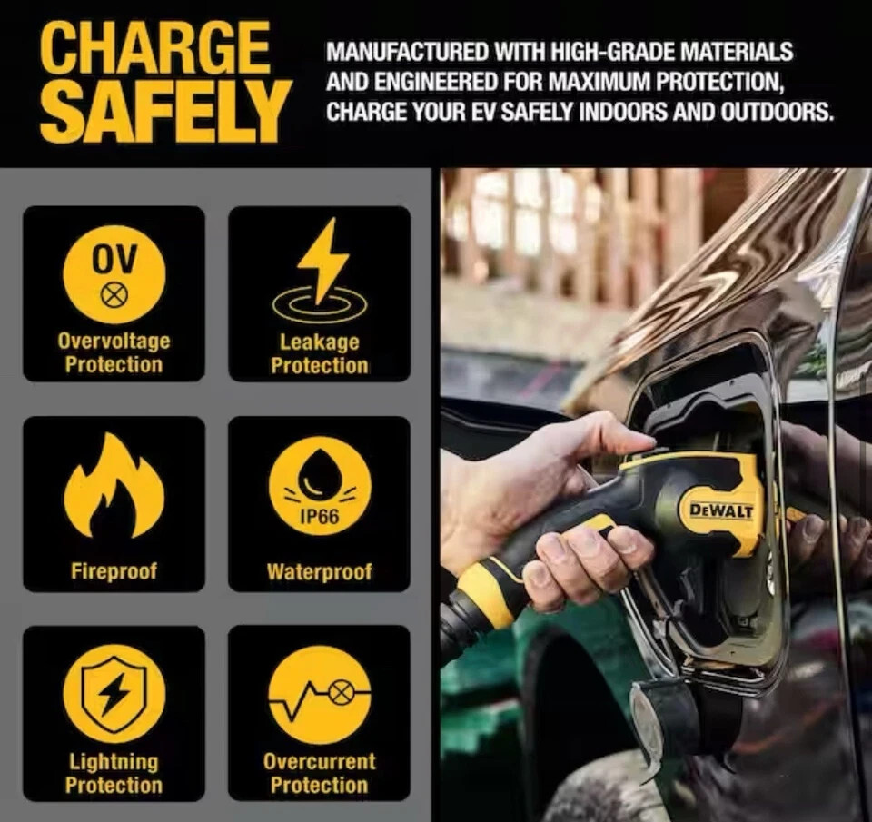 Charge Safely: Engineered for maximum safety, your electric vehicle is protected with DEWALT. Certified for indoor and outdoor use with IP66 waterproof rating (Name 4 x type enclosure), with over 10 technologically advanced safety features including overvoltage, overcurrent, overheat, overcharge and surge protection. Rest assured your EV is protected; CSA certified.